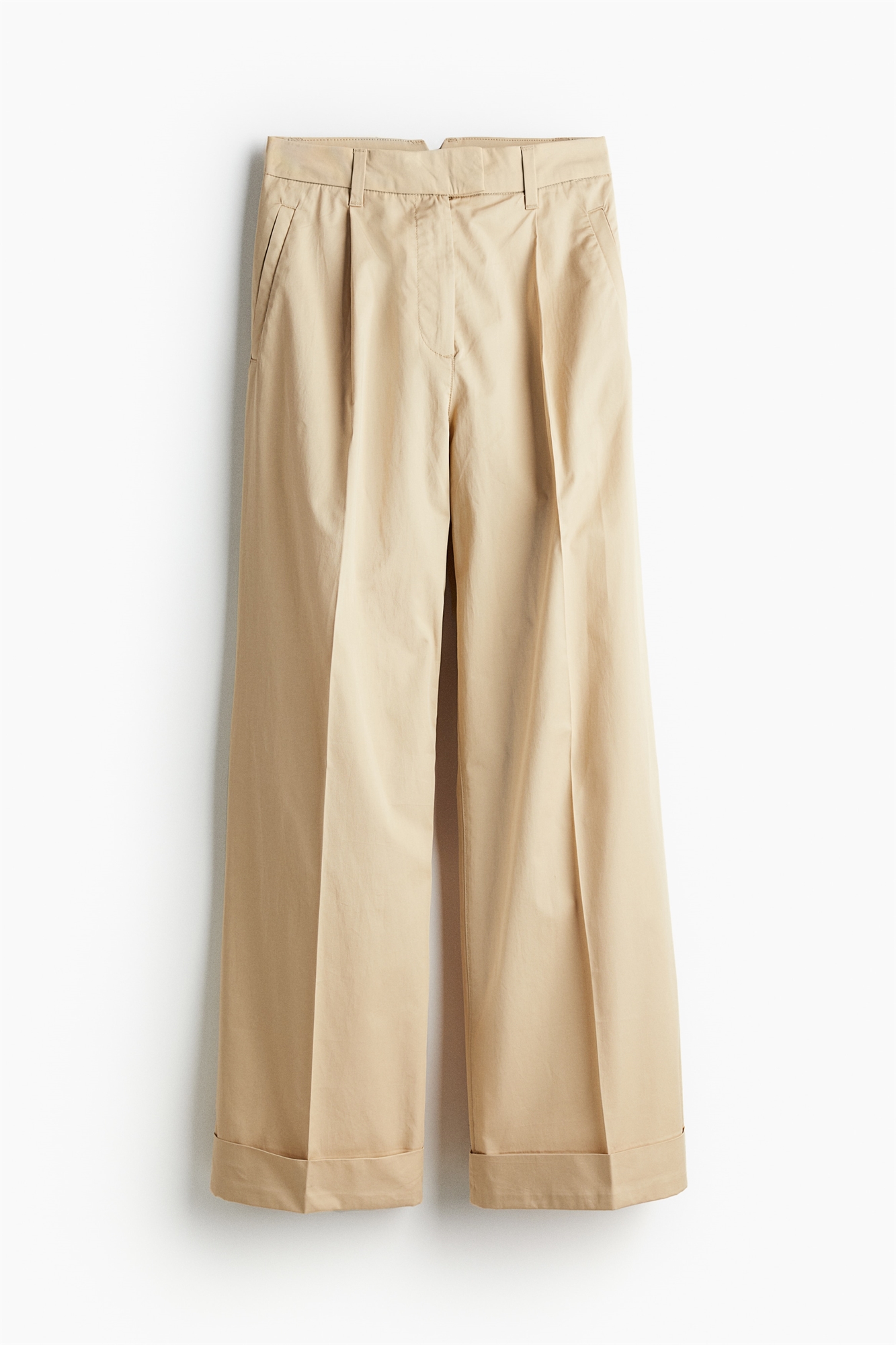 Свободные чиносы из хлопковой саржи с заниженной талией, V-образным вырезом и перекрещивающимися петлями для ремня сзади. Удлиненный пояс со скрытой застежкой на пуговицу, крючок и глазок, а также ширинка на молнии. Диагональные прорезные боковые карманы и фальшивые прорезные карманы сзади. Широкие ноги со складками в верхней части, складками спереди и подворотами.