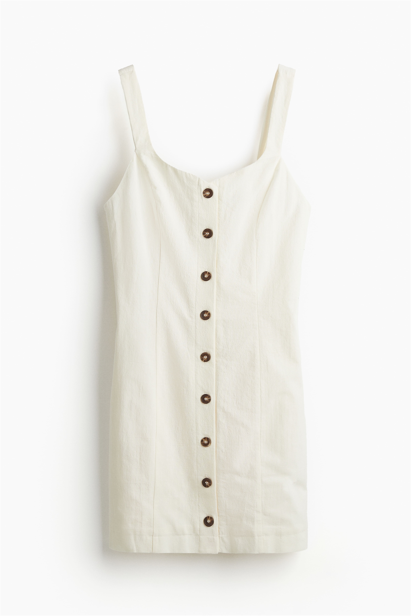 Короткое приталенное платье из хлопкового крепа с широкими бретелями, завязывающимися сзади. Вырез в форме сердца, пуговицы спереди и формирующие швы спереди и сзади.