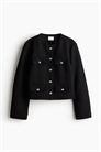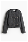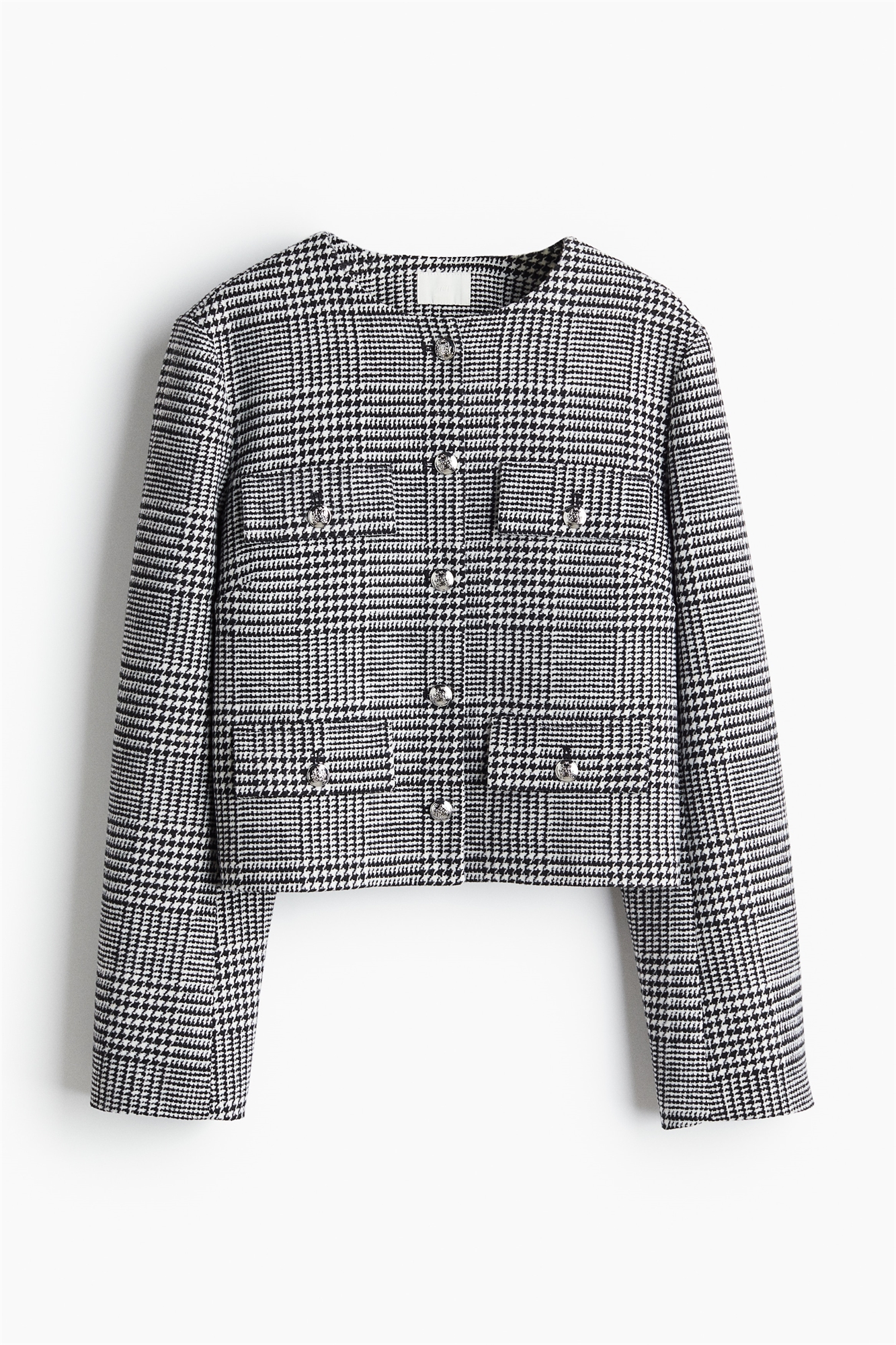 Жакет из тканого материала с круглым вырезом, пуговицами спереди и декоративными карманами с пуговицей спереди. На подкладке.