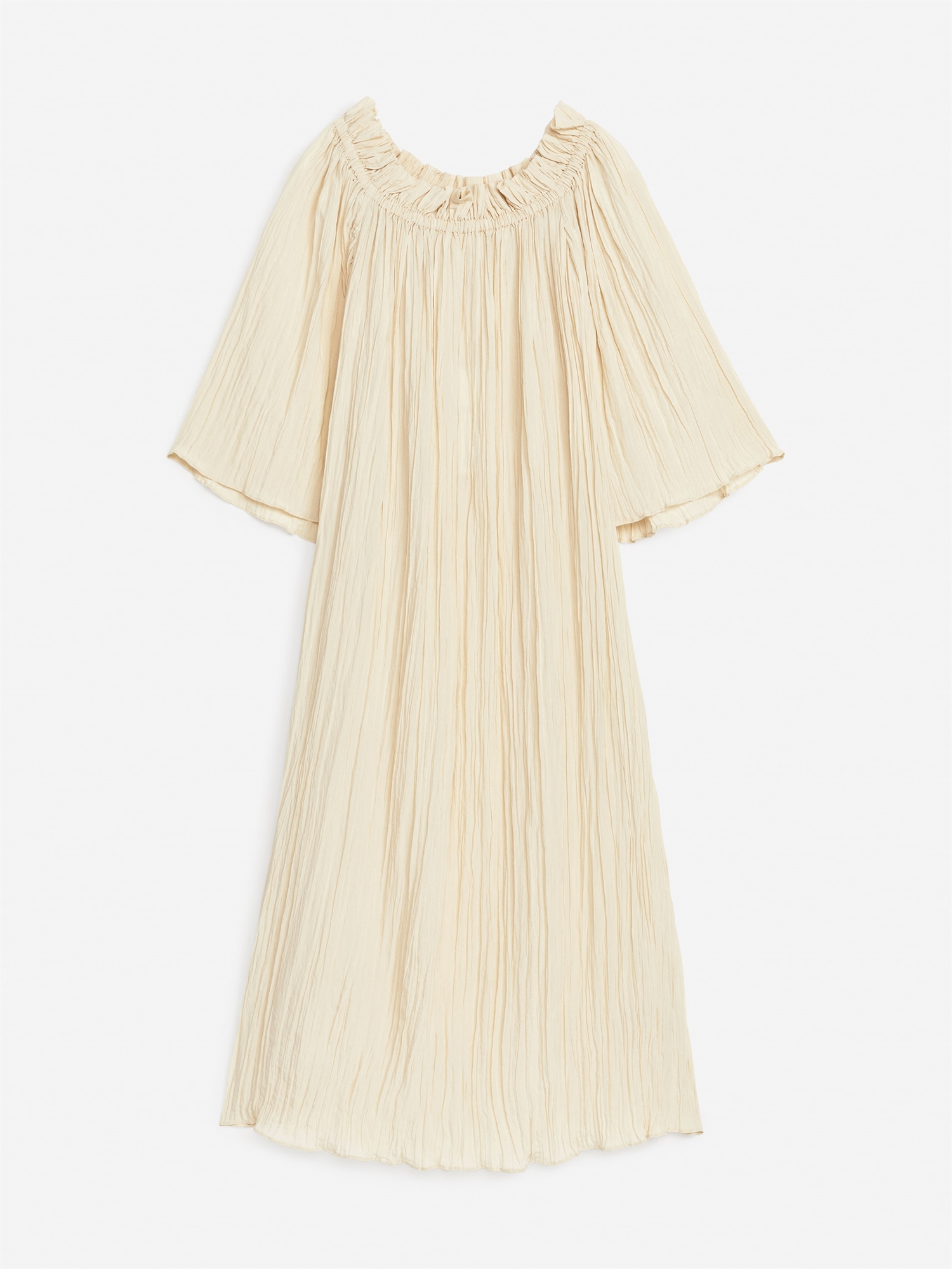 Платье на плечах с оборкой, эластичным вырезом и фактурной поверхностью. Фасон средней длины со слегка пышными рукавами. Обычный крой.