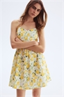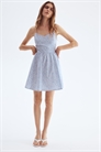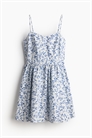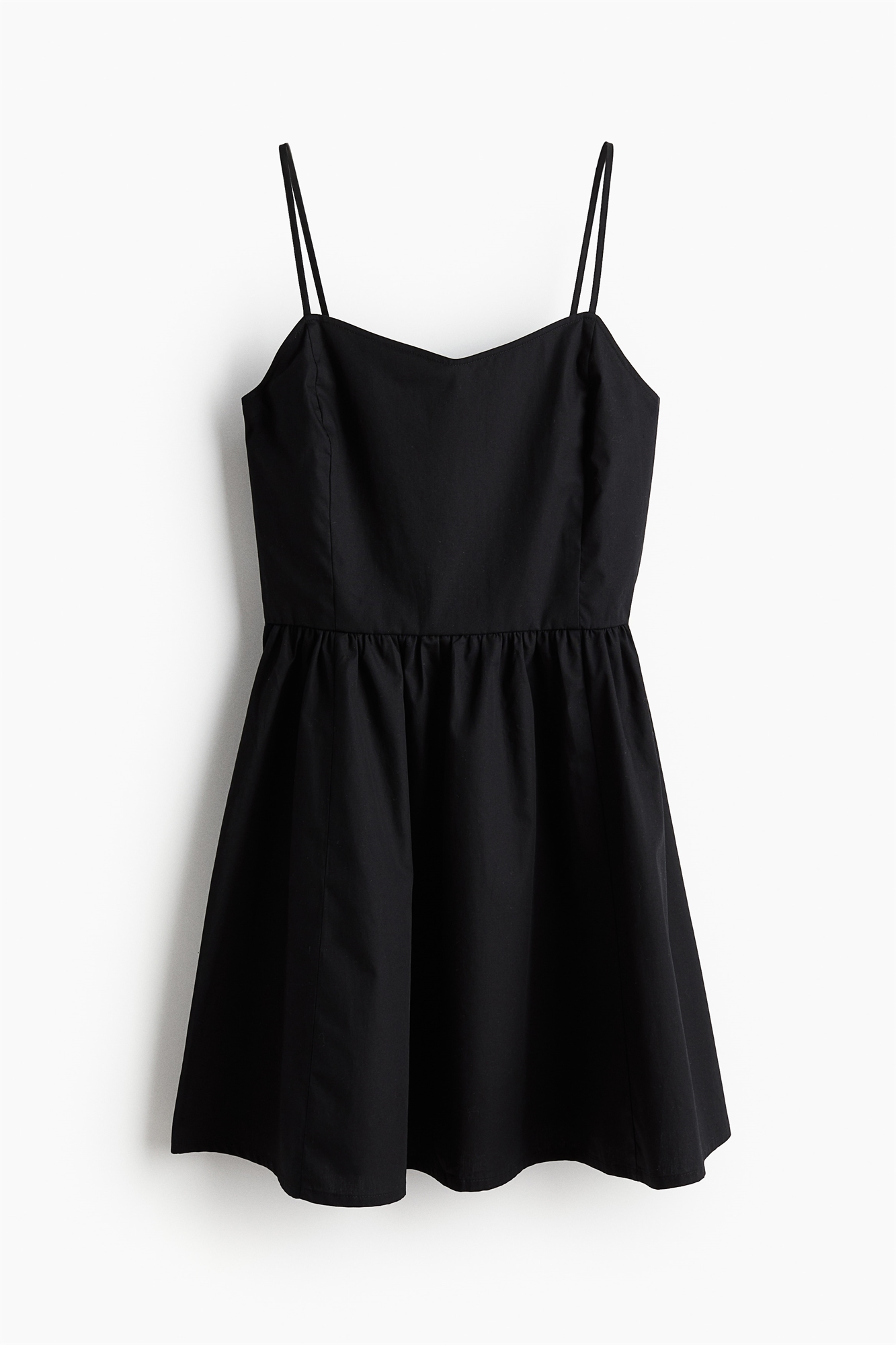 Короткое платье из воздушного хлопкового полотна с приталенным лифом с вырезом в форме сердца, узкими бретелями и широким швом на спине. Присборенный шов на талии с эластичной вставкой сзади и расклешенная юбка. Без подкладки.