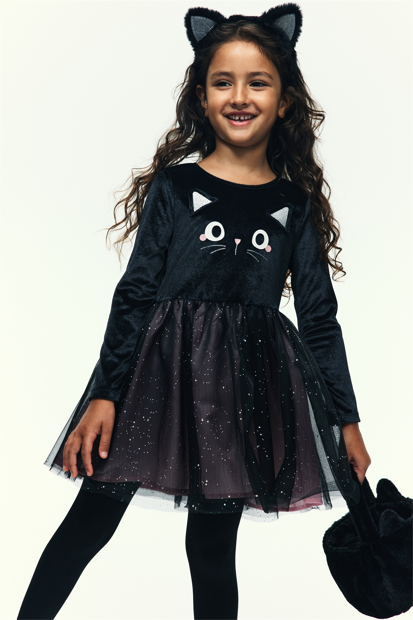 Танцевальное платье из принтованного трикотажа с юбкой из тюля. Круглый вырез, длинные рукава и сборчатый шов на талии. Юбка на подкладке.