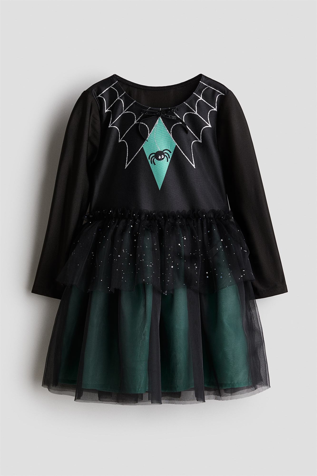 Танцевальное платье из принтованного трикотажа с юбкой из тюля. Круглый вырез, длинные рукава и сборчатый шов на талии. Юбка на подкладке.