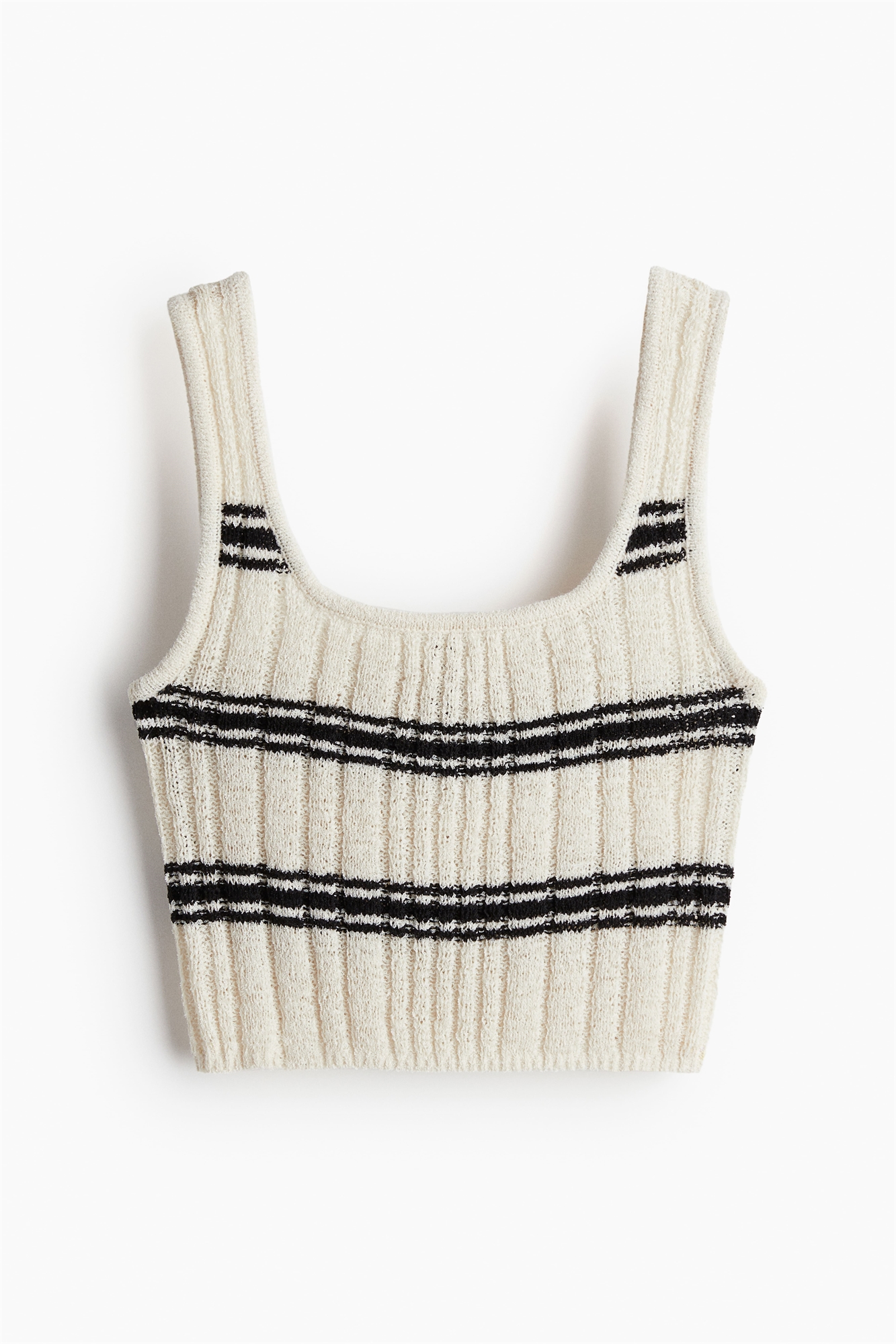 Обрезанный жилет-топ из неравномерного трикотажа в рубчик с глубоким круглым вырезом спереди и сзади.