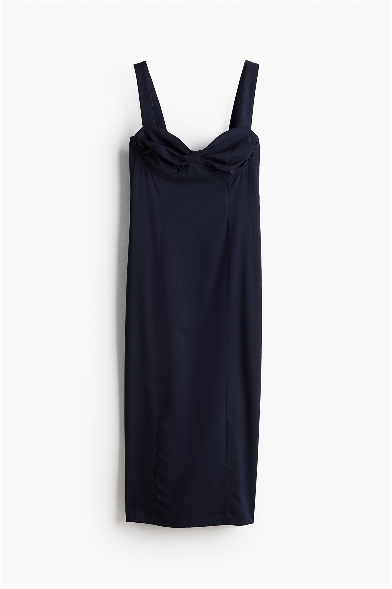 Приталенное платье длиной до колен из тканого материала с вырезом в форме сердца, собранными чашечками и формирующими швами спереди и сзади. Широкие бретели, платочная вставка сзади и потайная застежка-молния с одной стороны. Подол прямого покроя с разрезом сзади. Без подкладки.