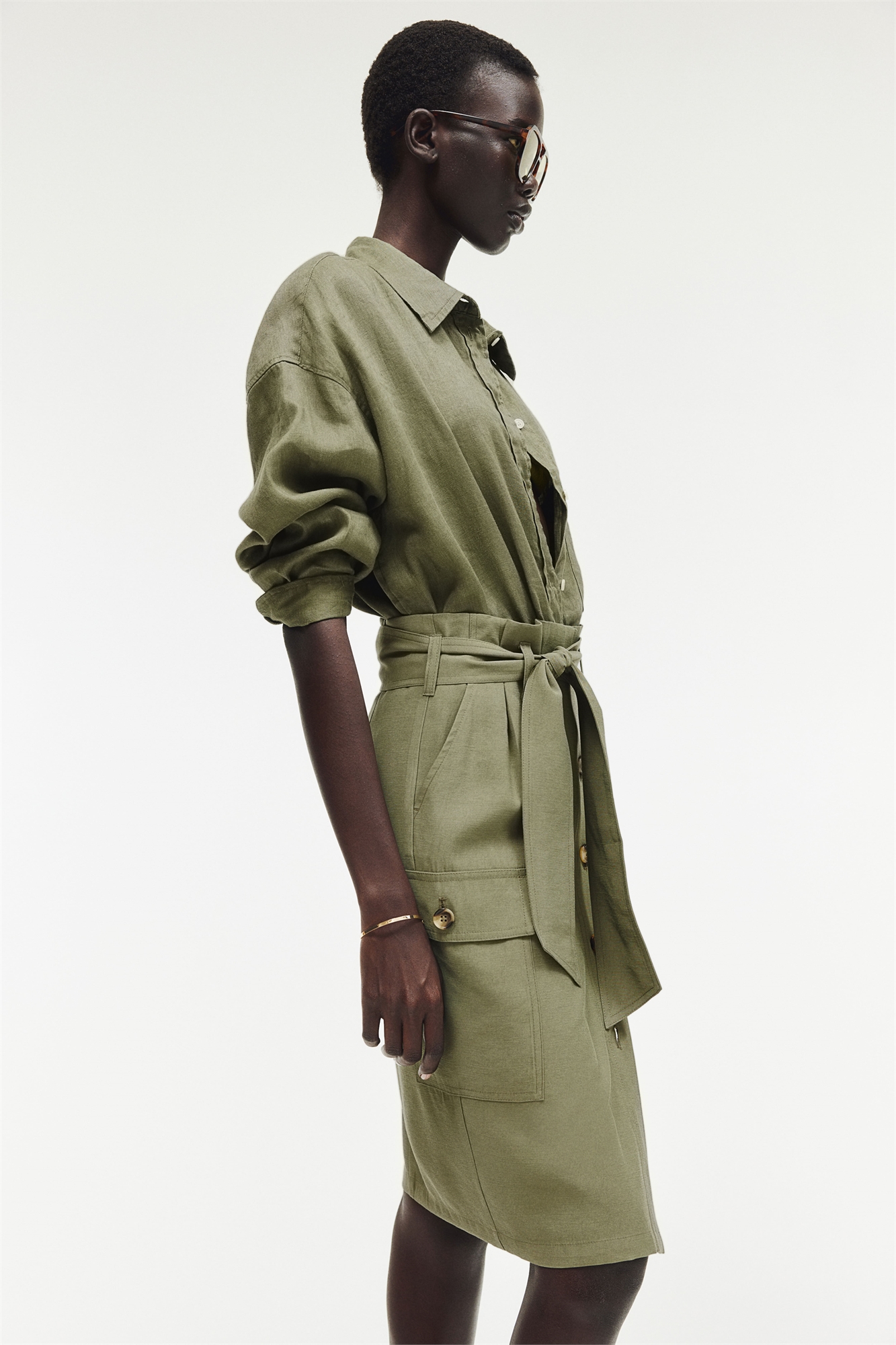Юбка длиной до колена из тканого материала с талией в виде бумажного мешка со складками спереди и съемным поясом-завязкой. Пуговицы спереди, диагональные боковые карманы и накладные карманы с клапаном и пуговицей. Без подкладки.