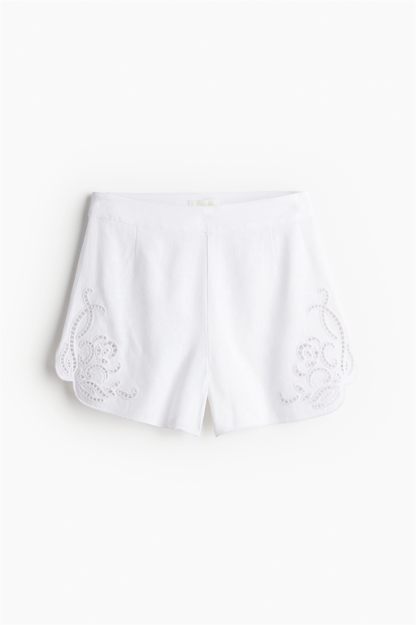 Шорты из льна и вискозы с переплетением бродери англез. Высокая талия, потайная застежка на молнию и крючок с глазом с одной стороны. На подкладке.
