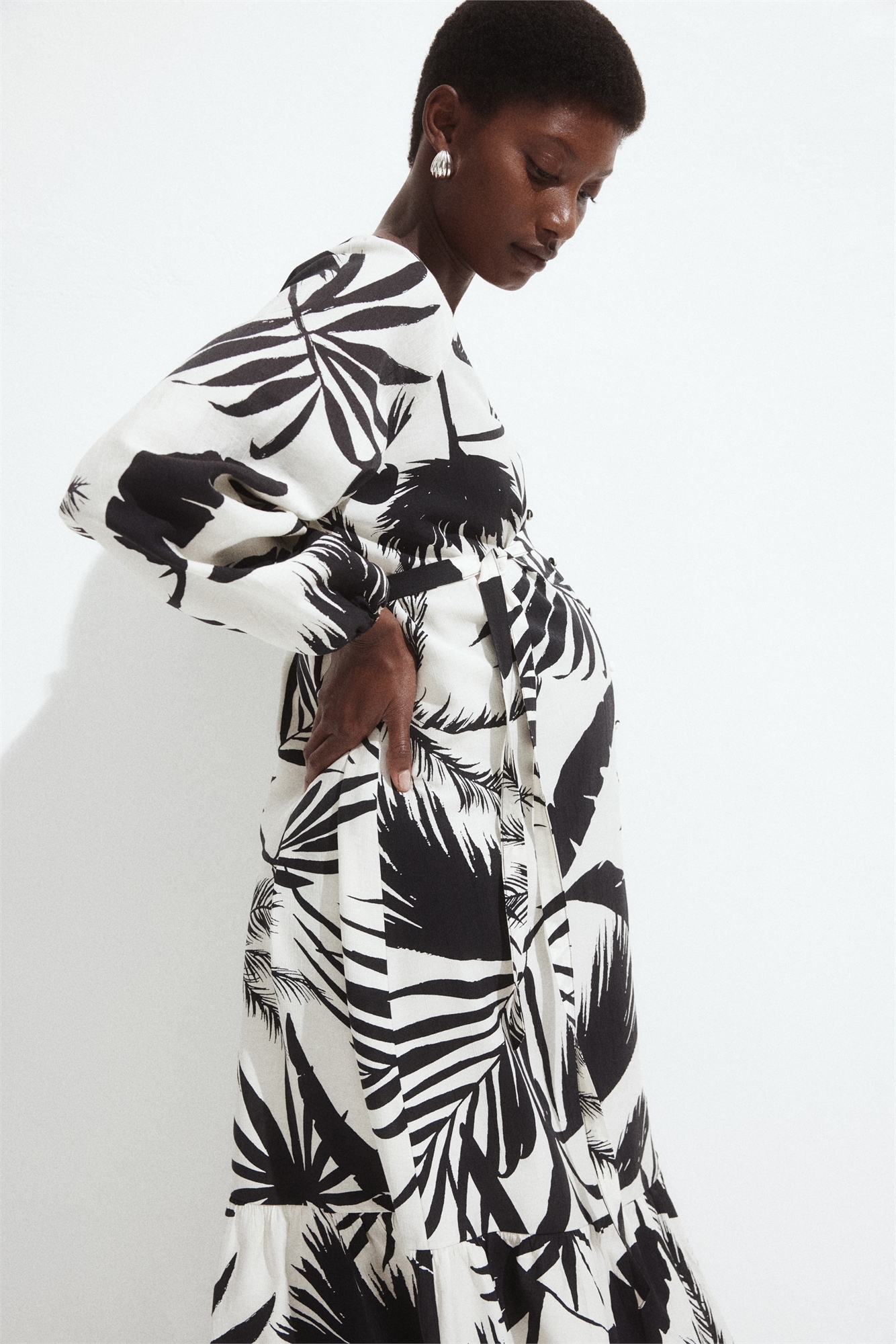Платье длиной до щиколоток из слегка фактурного материала с V-образным вырезом, застежкой на пуговицы спереди и съемным поясом-завязкой под бюстом. Длинные рукава-баллоны покроя реглан с узкими эластичными манжетами. Сборка над коленями для придания дополнительного объема. Без подкладки. Платье можно носить как во время, так и после беременности.