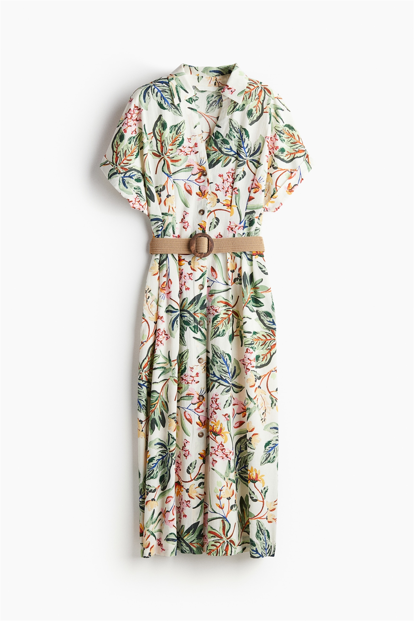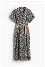 Платье свободного покроя длиной до колен из крепа с воротником, V-образной проймой и пуговицами спереди. Короткие рукава с отворотами и эластичный пояс на талии с деревянной пряжкой. Без подкладки.