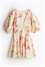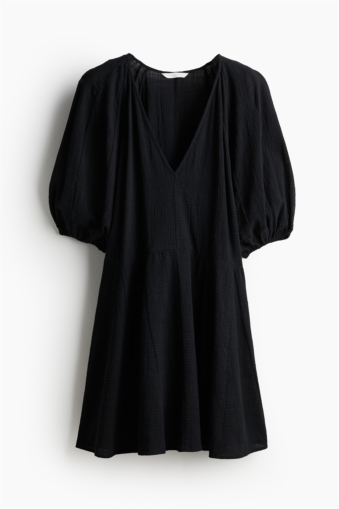Короткое платье из тканого материала с V-образным вырезом, рукавами-баллончиками длиной до локтя с эластичными манжетами и расклешенной юбкой со вставками для придания объема. Без подкладки.