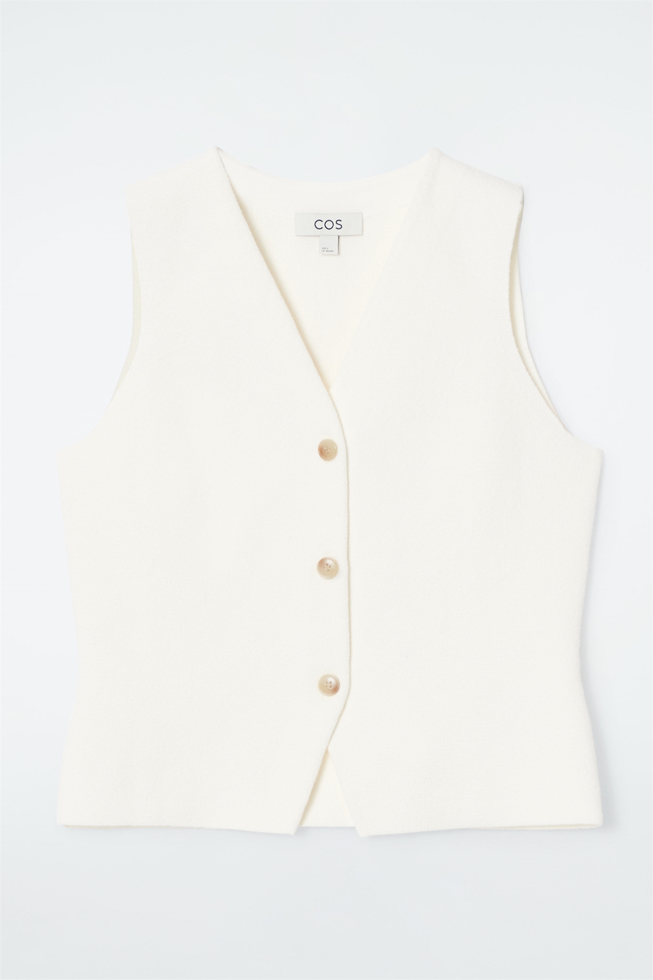 В этом сезоне команда женской одежды COS отбросила условности классического пошива. Эта жилетка тщательно вывязана из мягкого хлопка, смешанного с переработанными волокнами, и имеет V-образный подол, который подходит для ношения поверх брюк с широкими штанинами или юбок макси. Регулярный крой Застежка на пуговицы V-образный вырез Переработанный нейлон снижает потребность в ограниченных природных ресурсах и сокращает выбросы парниковых газов Состав: 60% хлопок, 39% переработанный полиамид (переработанный нейлон), 1% переработанный эластан. Без учета отделки / Машинная стирка Длина по спинке для размера S составляет 50,5 см / Модель носит размер S
