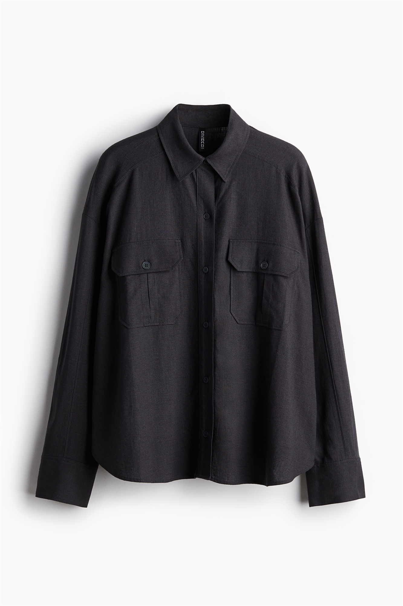 Рубашка оверсайз из воздушного льняного и вискозного полотна. Воротник, застежка на пуговицы спереди, передняя панель и нагрудные карманы со складками, клапаном и пуговицей. Направленные вперед плечевые швы, низко опущенные плечи и длинные рукава с манжетами на пуговицах. Аккуратный закругленный подол.
