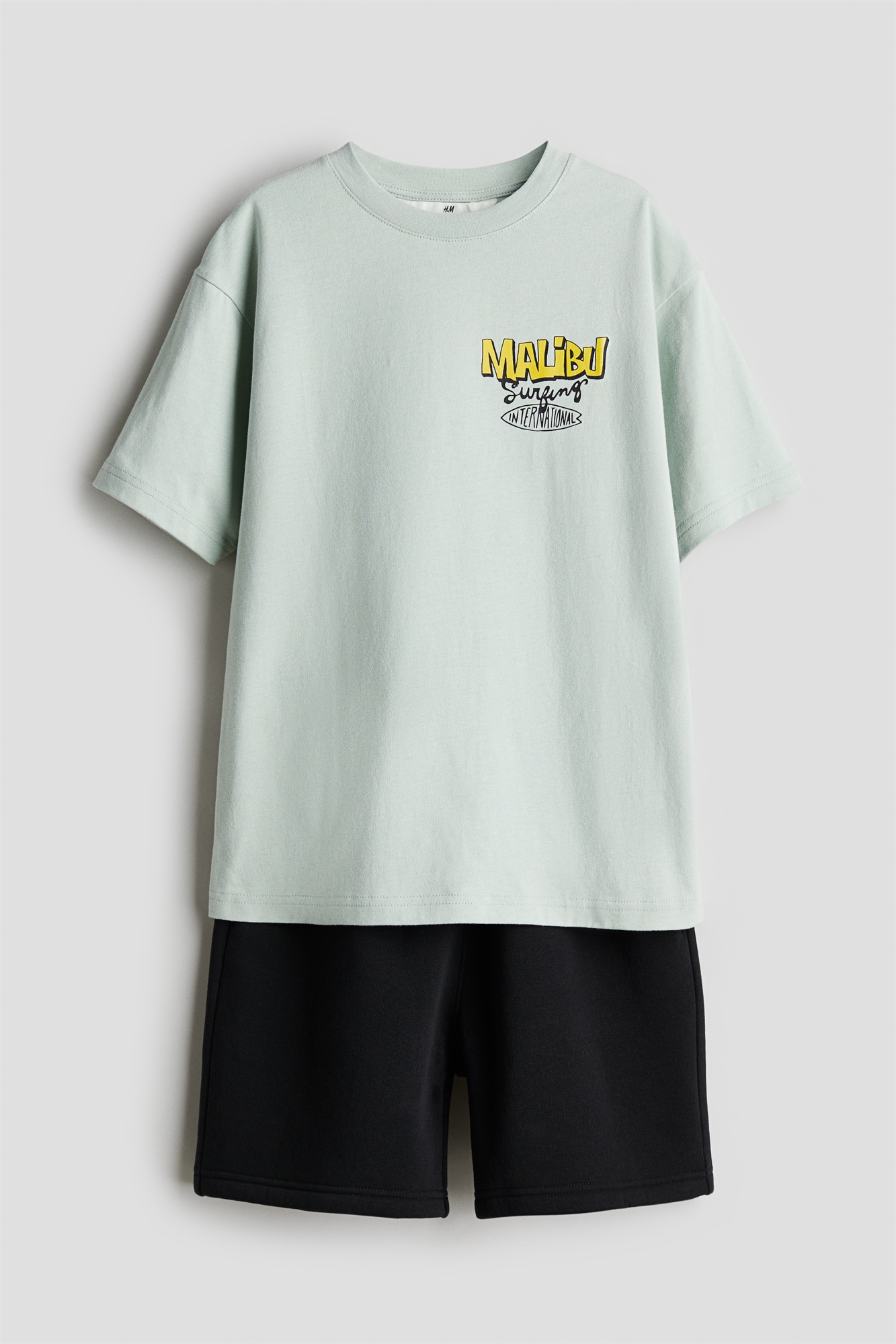 Комплект из футболки из мягкого хлопкового джерси и пары шорт из толстовки с мягкой ворсистой внутренней стороной. Футболка с круглым вырезом с ребристой отделкой и спущенными плечами. Шорты длиной до колена с эластичным утягивающим поясом и незаметными боковыми карманами.