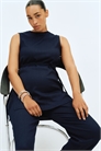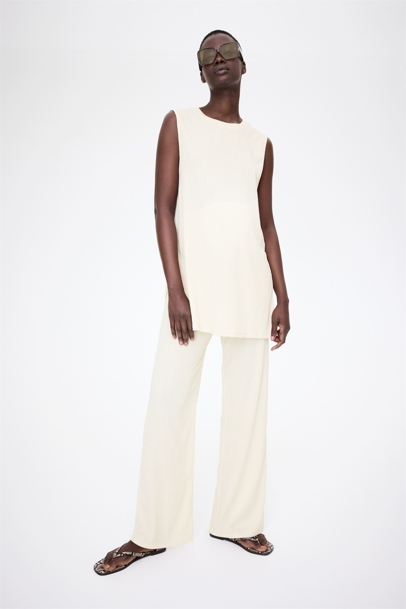 Комплект из топа без рукавов и брюк из фактурного джерси. Длинный топ с узкой окантовкой вокруг выреза, узким съемным поясом-завязкой под бюстом и прямым подолом с высоким разрезом с каждой стороны. Брюки с прямыми ногами и широким поясом из джерси для лучшей посадки на животе.