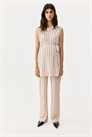 Комплект из топа без рукавов и брюк из фактурного джерси. Длинный топ с узкой окантовкой вокруг выреза, узким съемным поясом-завязкой под бюстом и прямым подолом с высоким разрезом с каждой стороны. Брюки с прямыми ногами и широким поясом из джерси для лучшей посадки на животе.