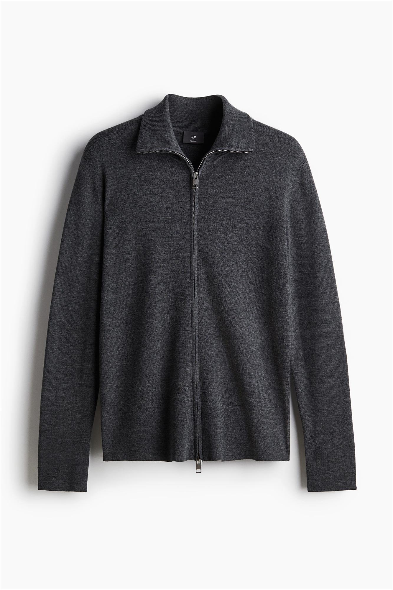 Вязаный кардиган на молнии с зауженным кроем из мягкой ткани. Круглый вырез с воротником и универсальная двухсторонняя застежка-молния.