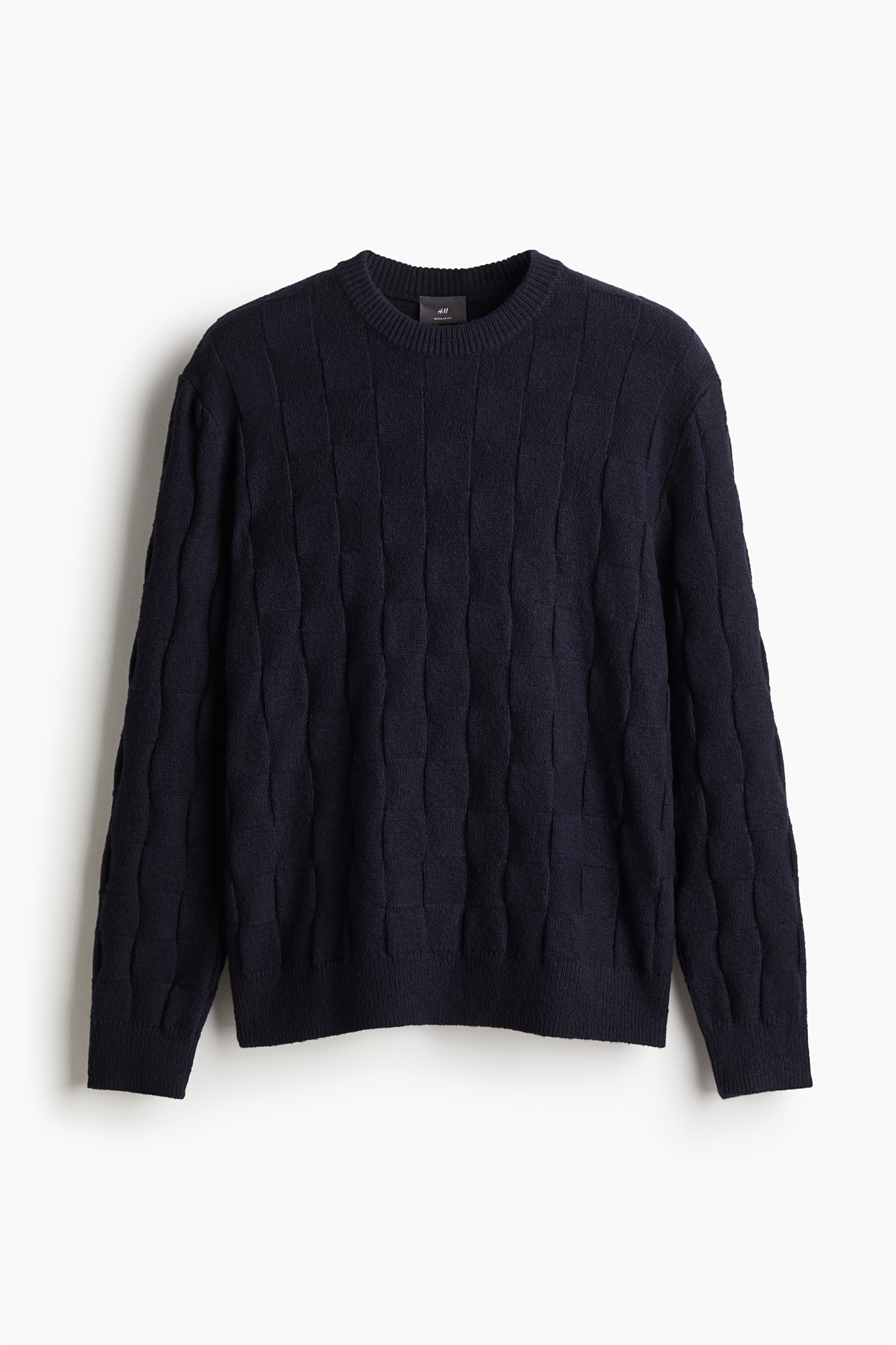 Джемпер из фактурного хлопкового трикотажа с круглым вырезом в рубчик, длинными рукавами и рубчиком на манжетах и подоле. Регулярный крой обеспечивает удобство ношения и классический силуэт.