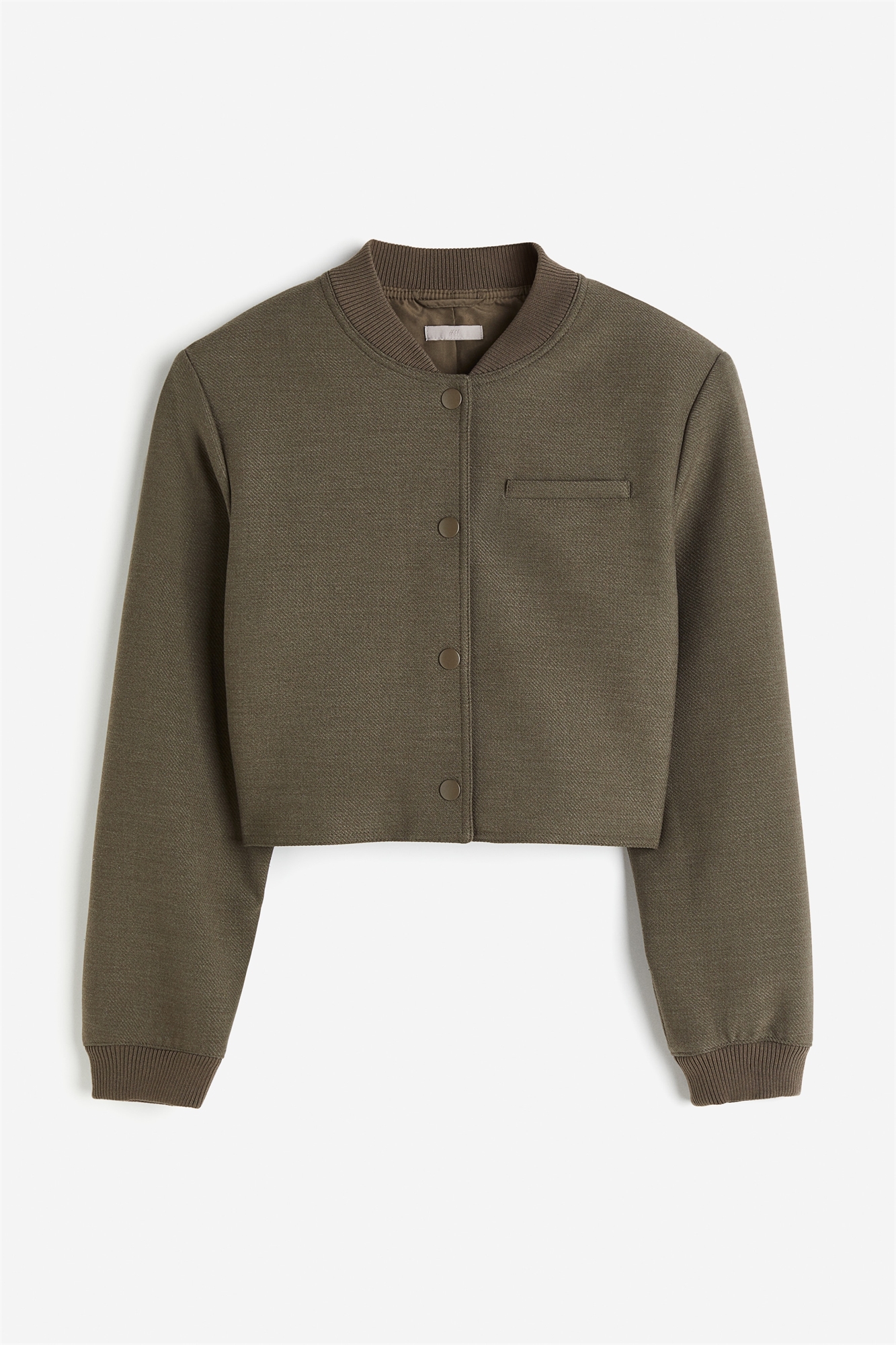 Короткая куртка свободного покроя из тканого материала с небольшим ребристым воротником, застежками на кнопки спереди, нагрудным карманом и слегка спущенными плечами с подплечниками. Рифленые манжеты. На подкладке.