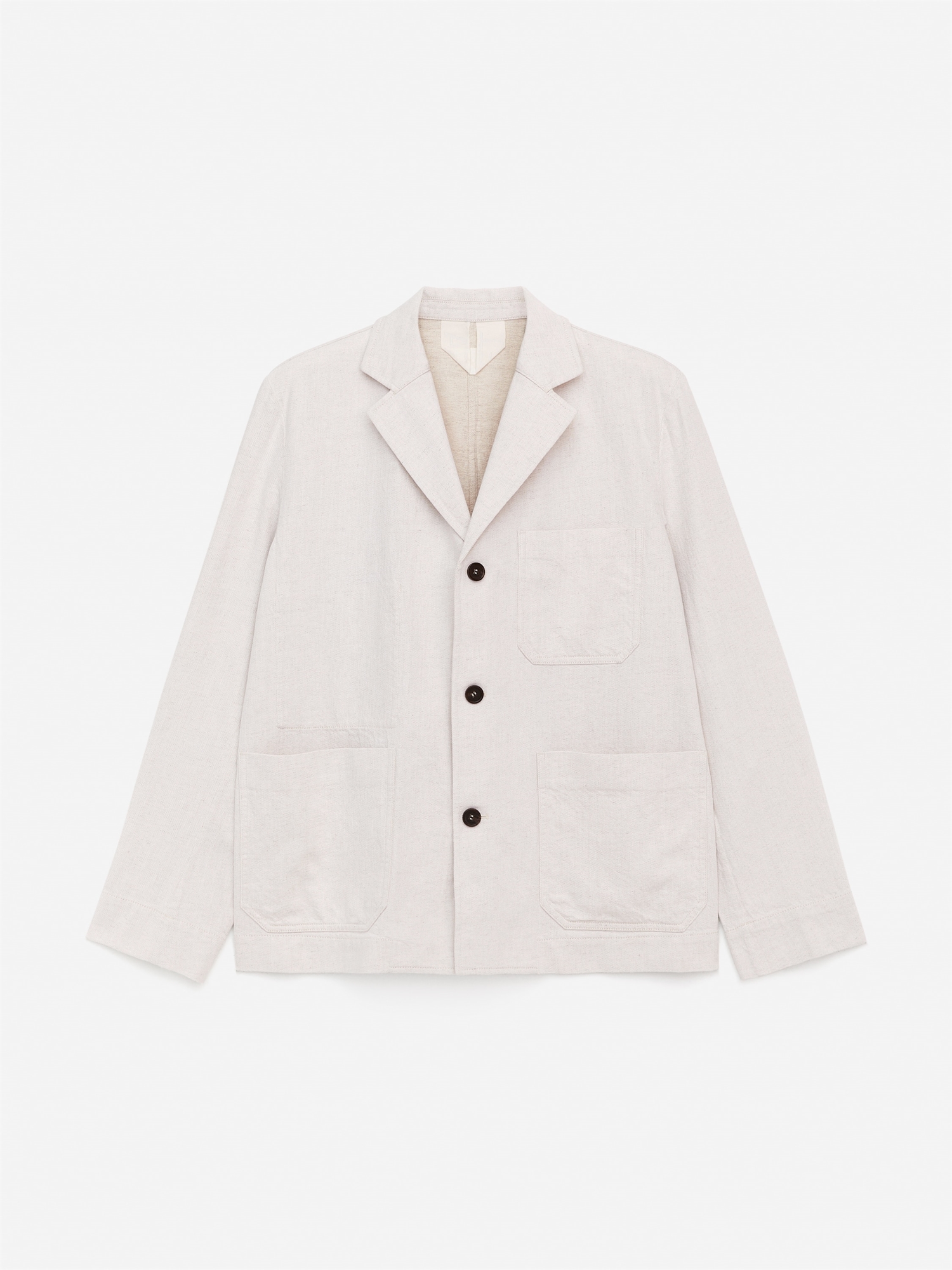Хлопковый льняной блейзер обычного покроя. Однобортный фасон с одним нагрудным и двумя накладными карманами. Пуговицы Corozo из ореха тагуа. Без подкладки. Входит в комплект.