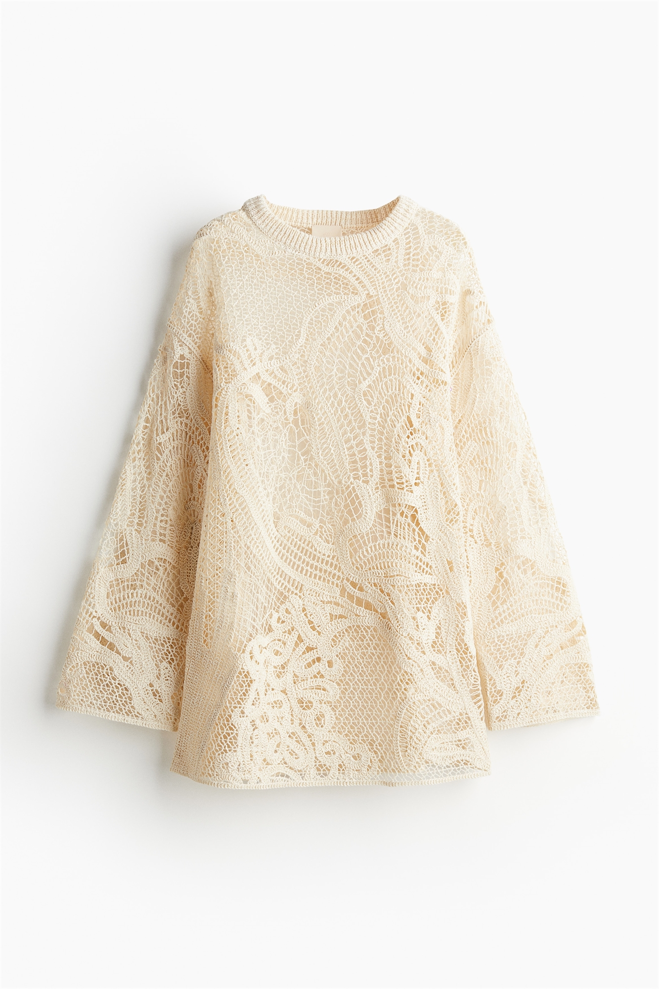 Слегка удлиненный джемпер большого размера из шерстяной смеси с вязаным рисунком. Круглый вырез с ребристой отделкой, спущенные плечи и длинные рукава. Узкий рубчик на манжетах и подоле.
