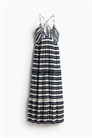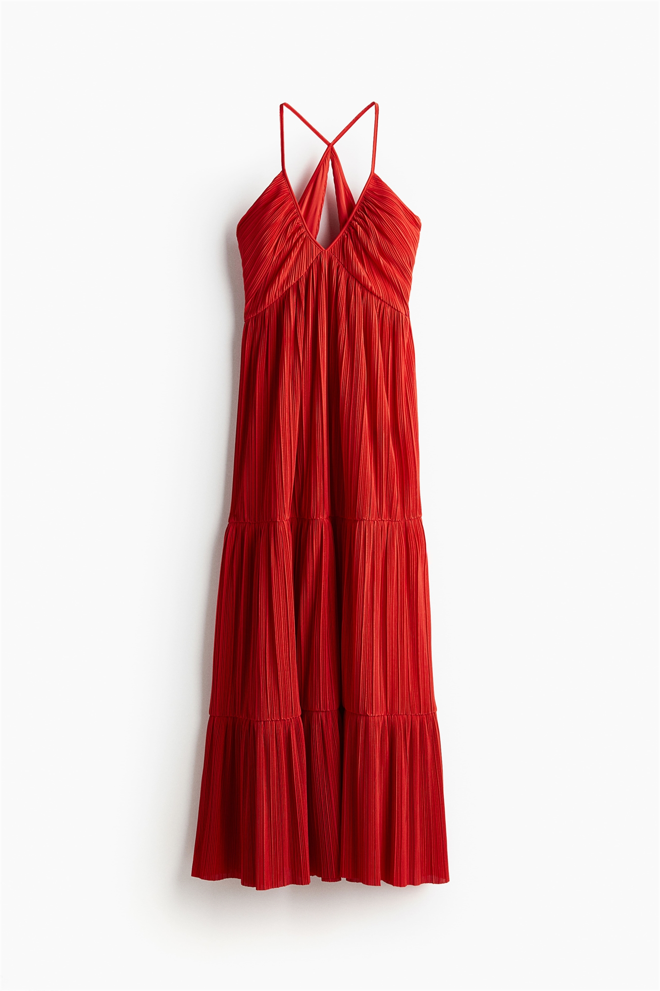 Длинное платье-плиссе из джерси с глубоким V-образным вырезом и узкими бретелями, перекрещивающимися сзади. Глубокая пройма сзади, потайная застежка-молния с одной стороны и собранные ярусы на юбке для придания объема. Частично на подкладке.