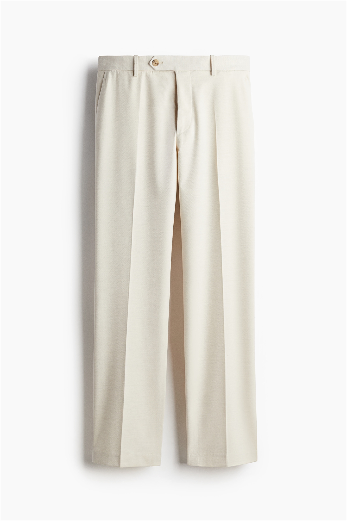 Костюмные брюки мягкого плетения с ширинкой на молнии, удлиненным поясом с пуговицей, боковыми карманами, втачными задними карманами с пуговицей и ногами со складками. Регулярный крой для комфортной носки и классического силуэта.