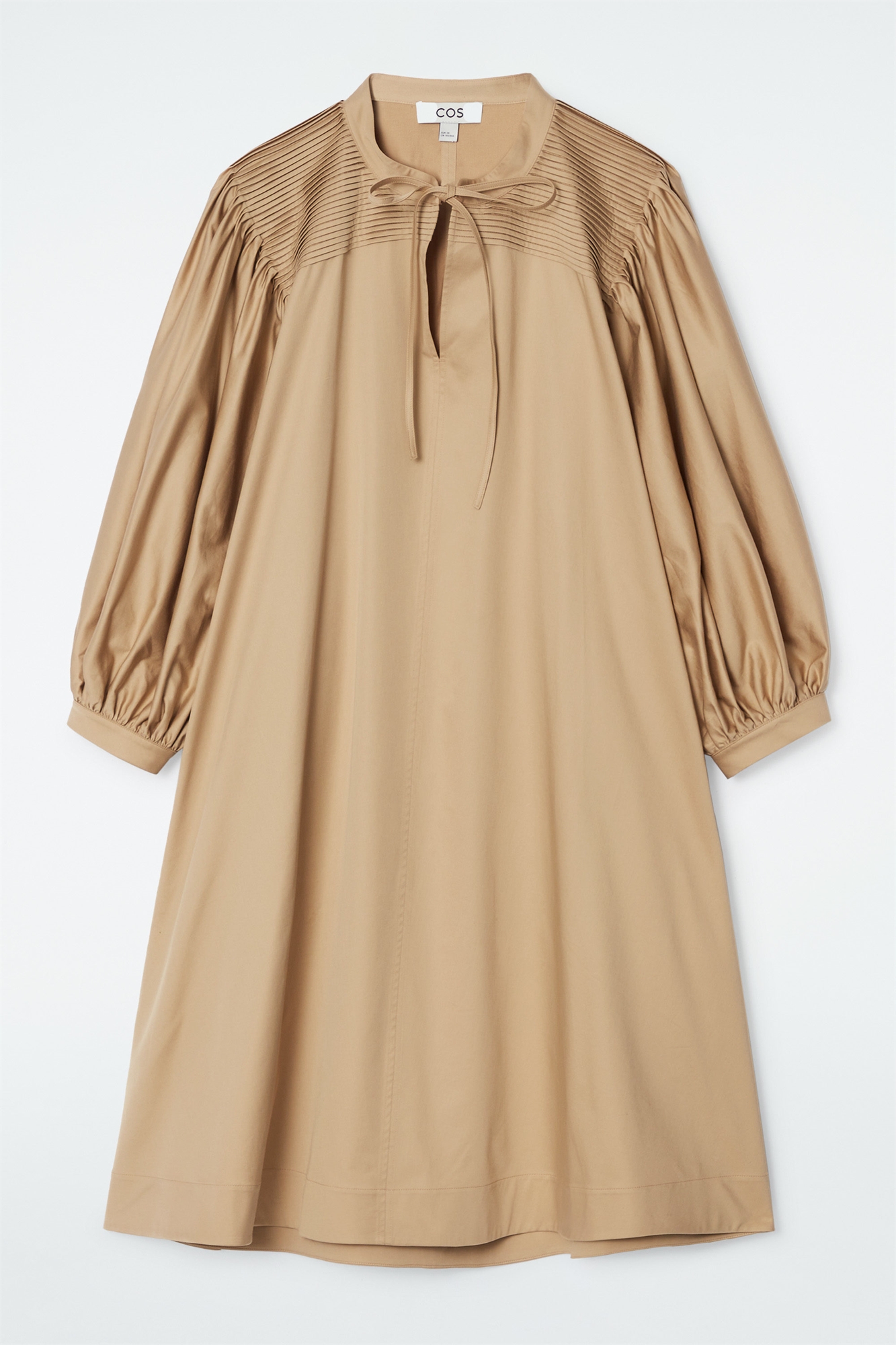 Это мини-платье А-линии с длинными рукавами, складками на плечах, вырезом в виде замочной скважины с завязками и собранными рукавами. Благодаря легкому хлопковому материалу оно идеально подходит для прогулок на солнце. Свободный крой Застежка на завязках Рукава длиной три четверти Внешняя ткань: 97 % хлопок, 3 % эластан. Детали исключены/Машинная стирка Длина по спинке в размере 36 = 96,6 см/Модель носит размер 36