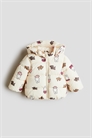Стеганая пуховая куртка из тканого материала с воротником-стойкой, съемным капюшоном с аппликациями и застежкой на молнию спереди и защитой подбородка от натирания. Скрытая эластичная резинка на манжетах и подоле. На подкладке.