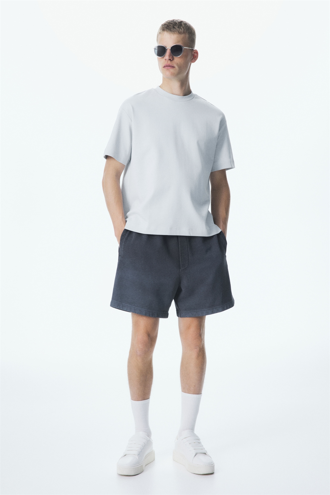 Футболка из плотного хлопкового джерси с круглым вырезом в рубчик, спущенными плечами и прямым покроем. Свободный крой для объемного, но не чрезмерно большого силуэта.