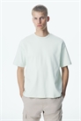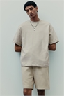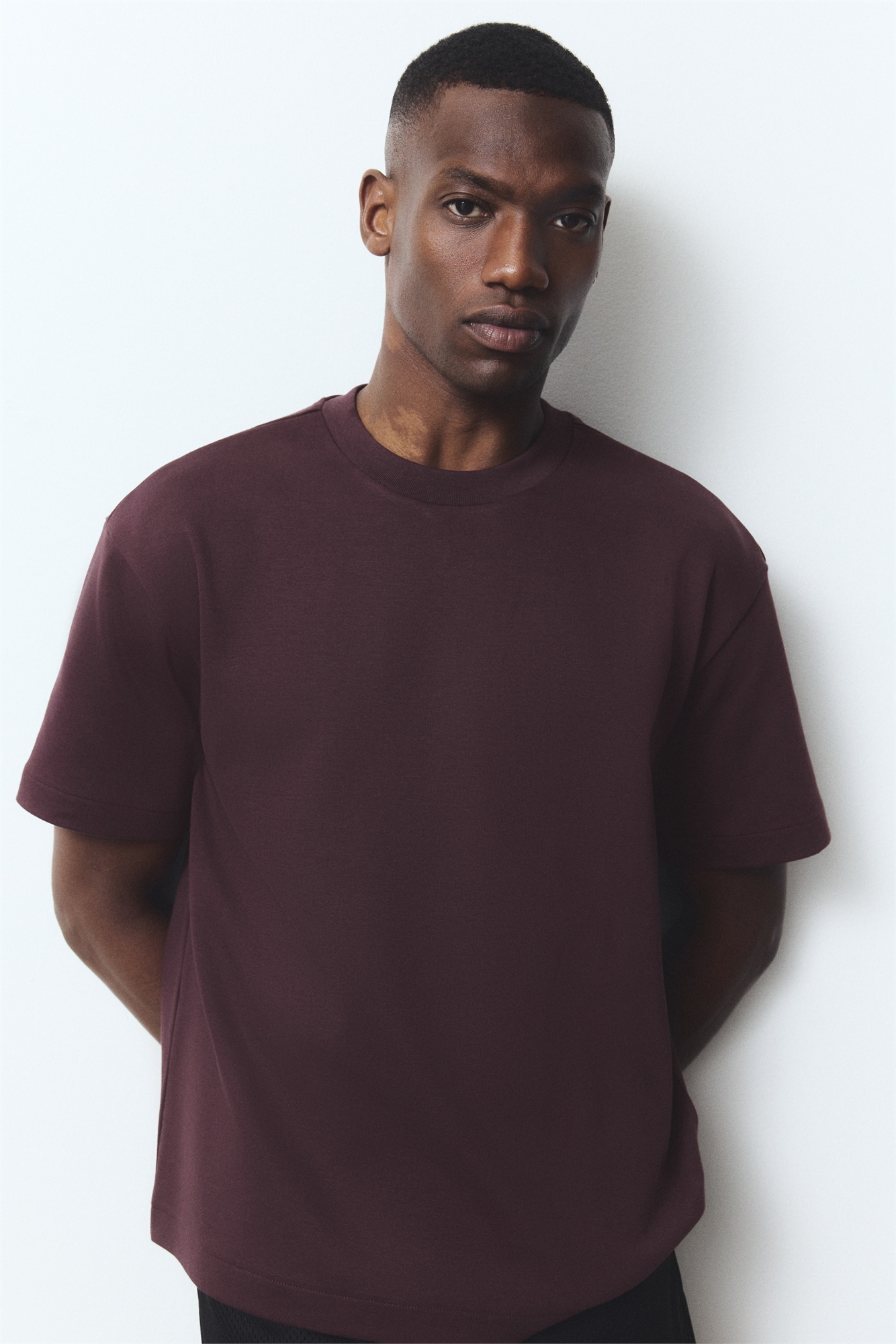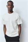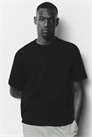 Футболка из плотного хлопкового джерси с круглым вырезом в рубчик, спущенными плечами и прямым покроем. Свободный крой для объемного, но не чрезмерно большого силуэта.