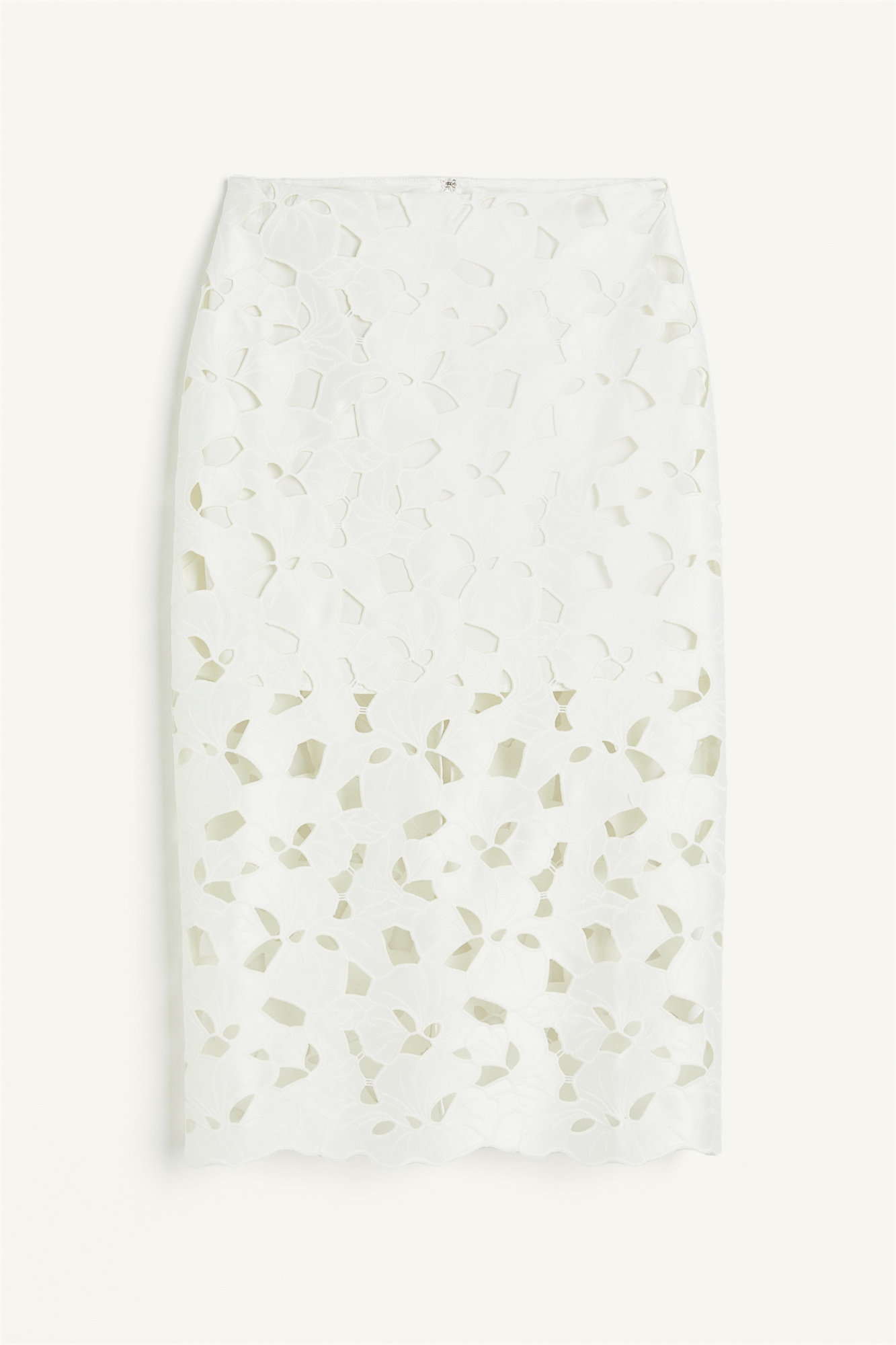 Атласная юбка длиной до колена с отделкой бродери-англиз. Высокий пояс с формирующими вытачками и потайная застежка-молния сзади. Гребешковый край по подолу и высокий разрез сзади. Атласная подкладка.