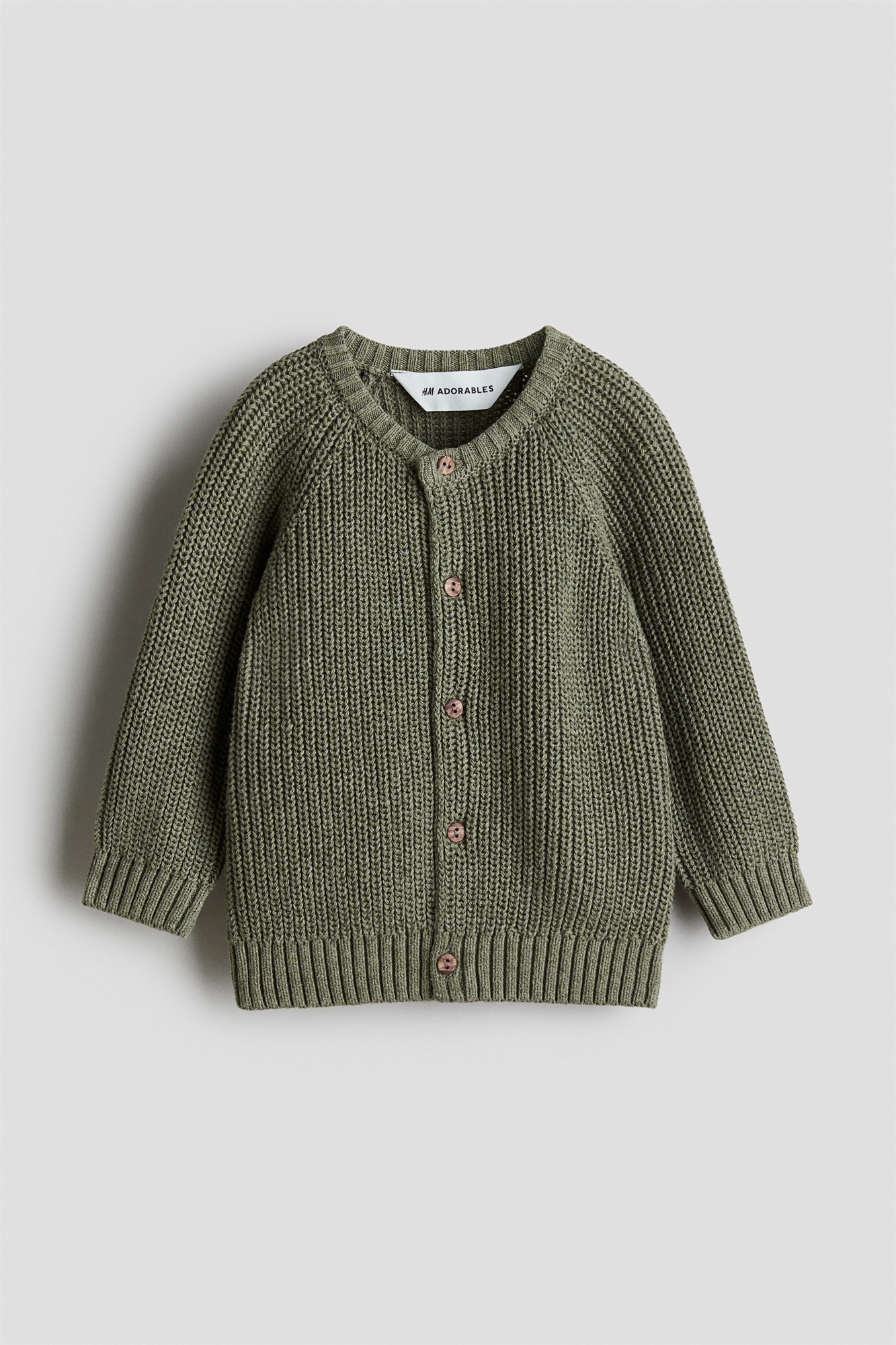 H&M Adorables. Кардиган мягкой лакированной вязки из высококачественного хлопка. Кардиган имеет круглый вырез с ребристой отделкой, пуговицы corozo спереди и длинные рукава реглан. Манжеты и подол отделаны ребрами жесткости. Коллекция H&M Adorables - это подборка удобных и качественных вещей, не теряющих актуальности.