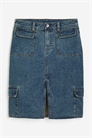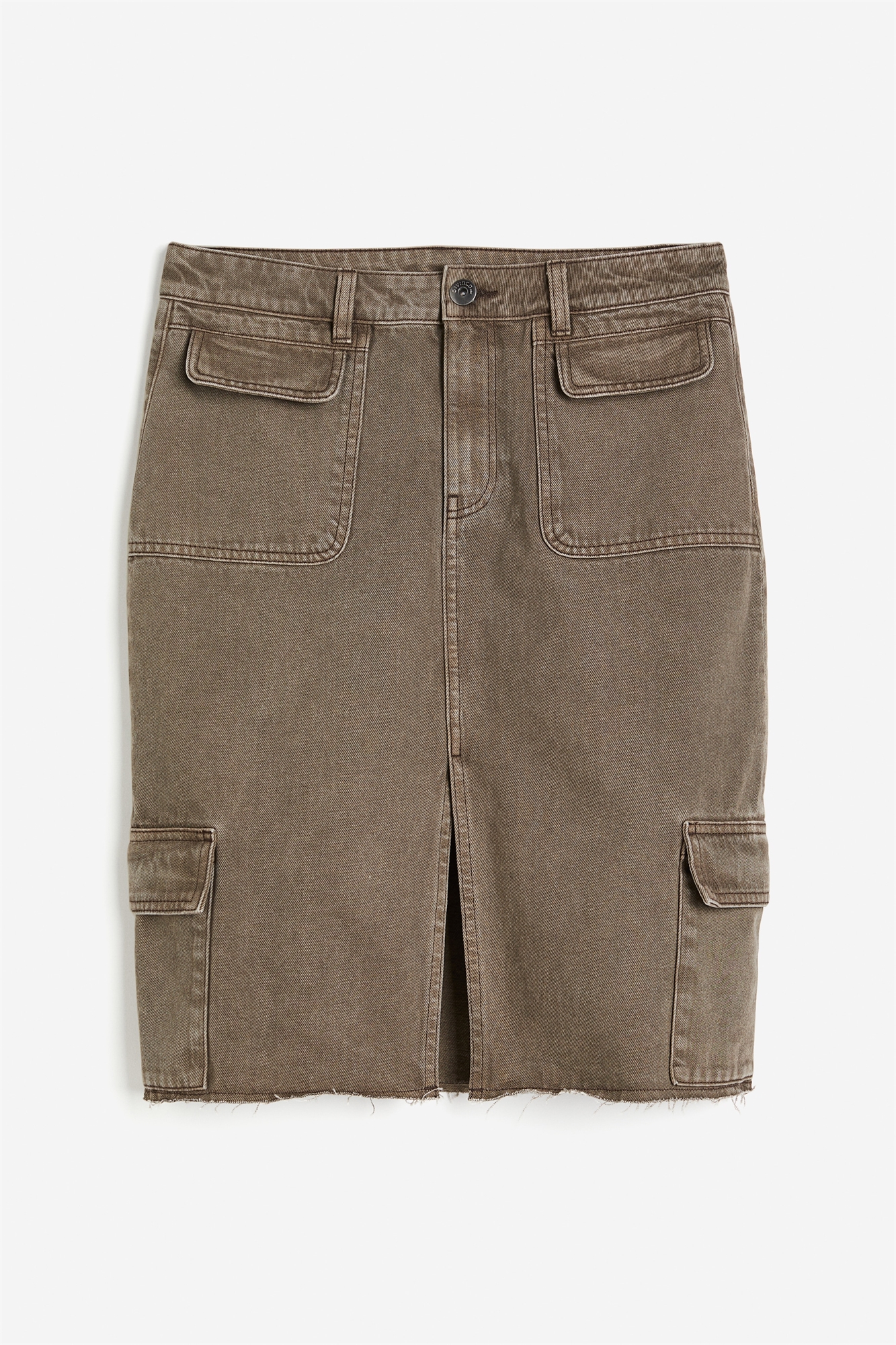 Приталенная юбка длиной до колена из жесткого хлопкового денима с ширинкой на молнии и пуговице. Фальшивые передние карманы с клапаном, настоящие задние карманы и накладные карманы над подолом. Необработанный подол с высоким разрезом спереди.