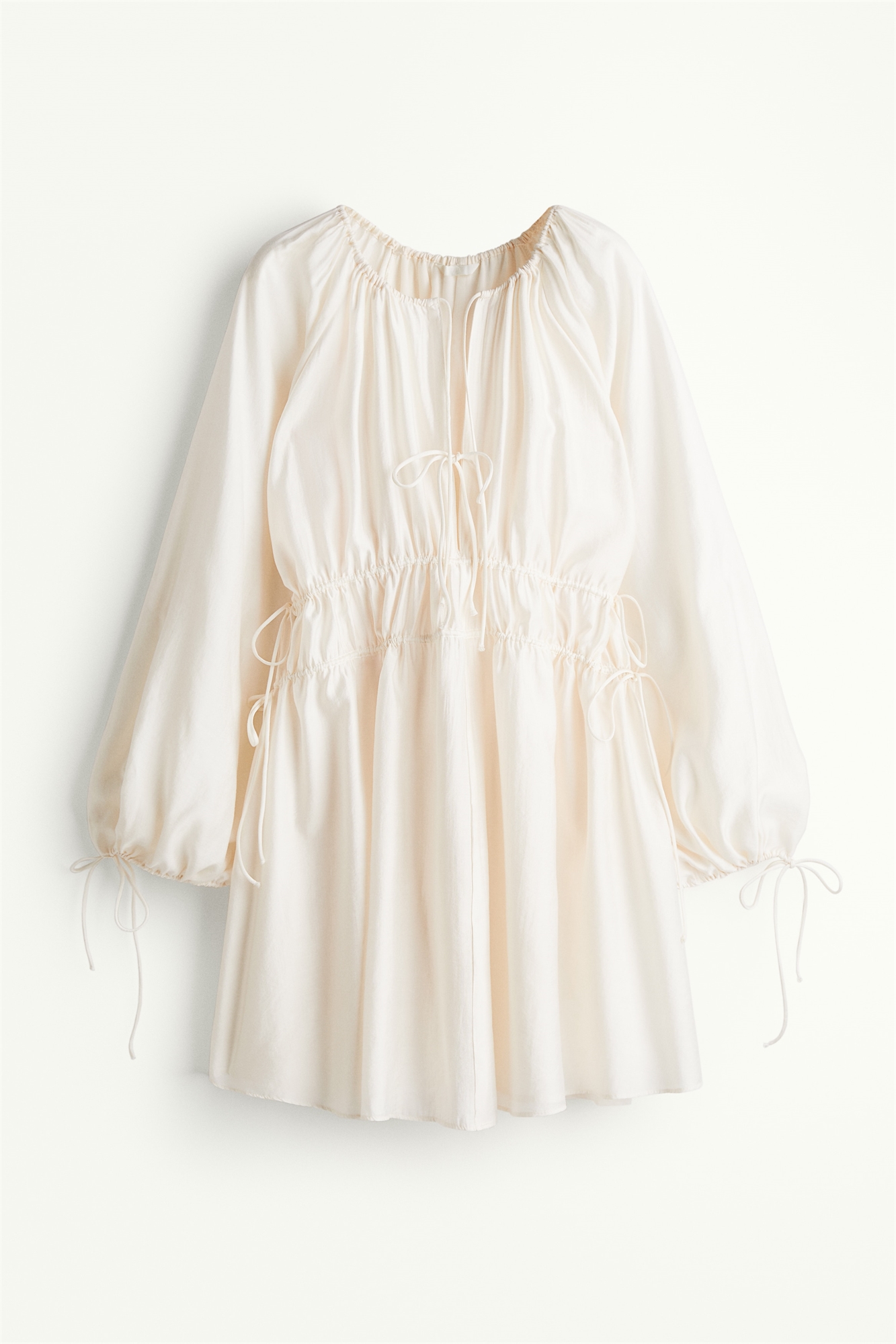 Короткое платье больших размеров из тканого материала с круглым вырезом на завязках и V-образной проймой с завязками-спагетти спереди. Длинные объемные рукава-баллоны покроя реглан с завязками на манжетах. Двойные завязки-спагетти на талии, которые завязываются по бокам. Частично на подкладке.