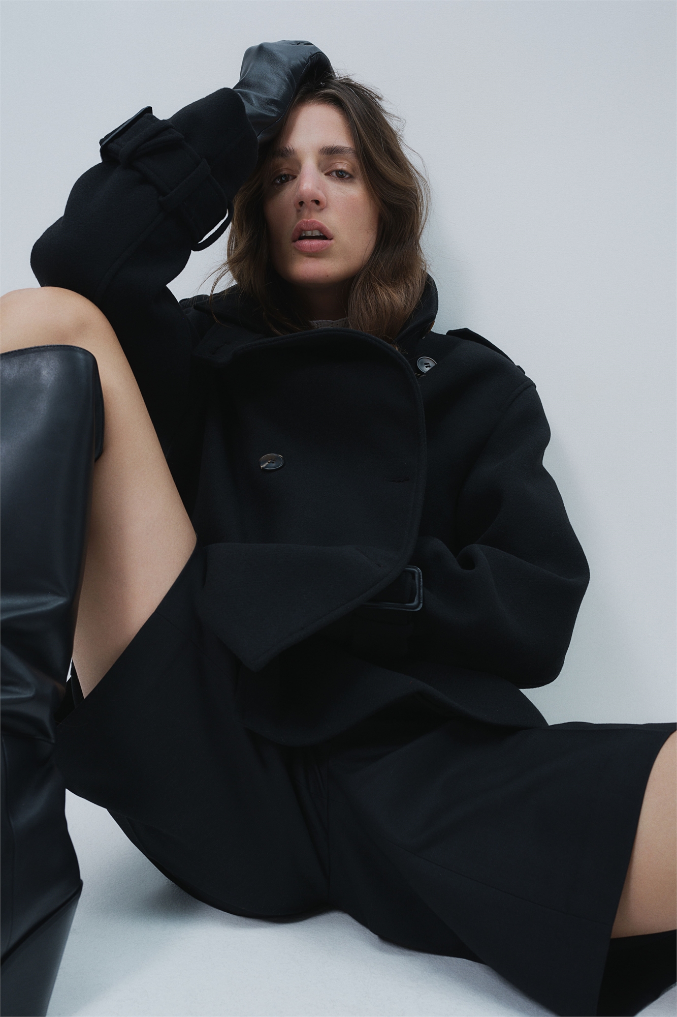 Короткий двубортный тренч из тканого материала с широкими лацканами с вырезом и застежкой на пуговицу. Погоны на пуговицах, длинные рукава и регулируемая закладка с закрытой застежкой на манжетах. Незаметные карманы в боковых швах. На подкладке.