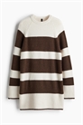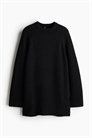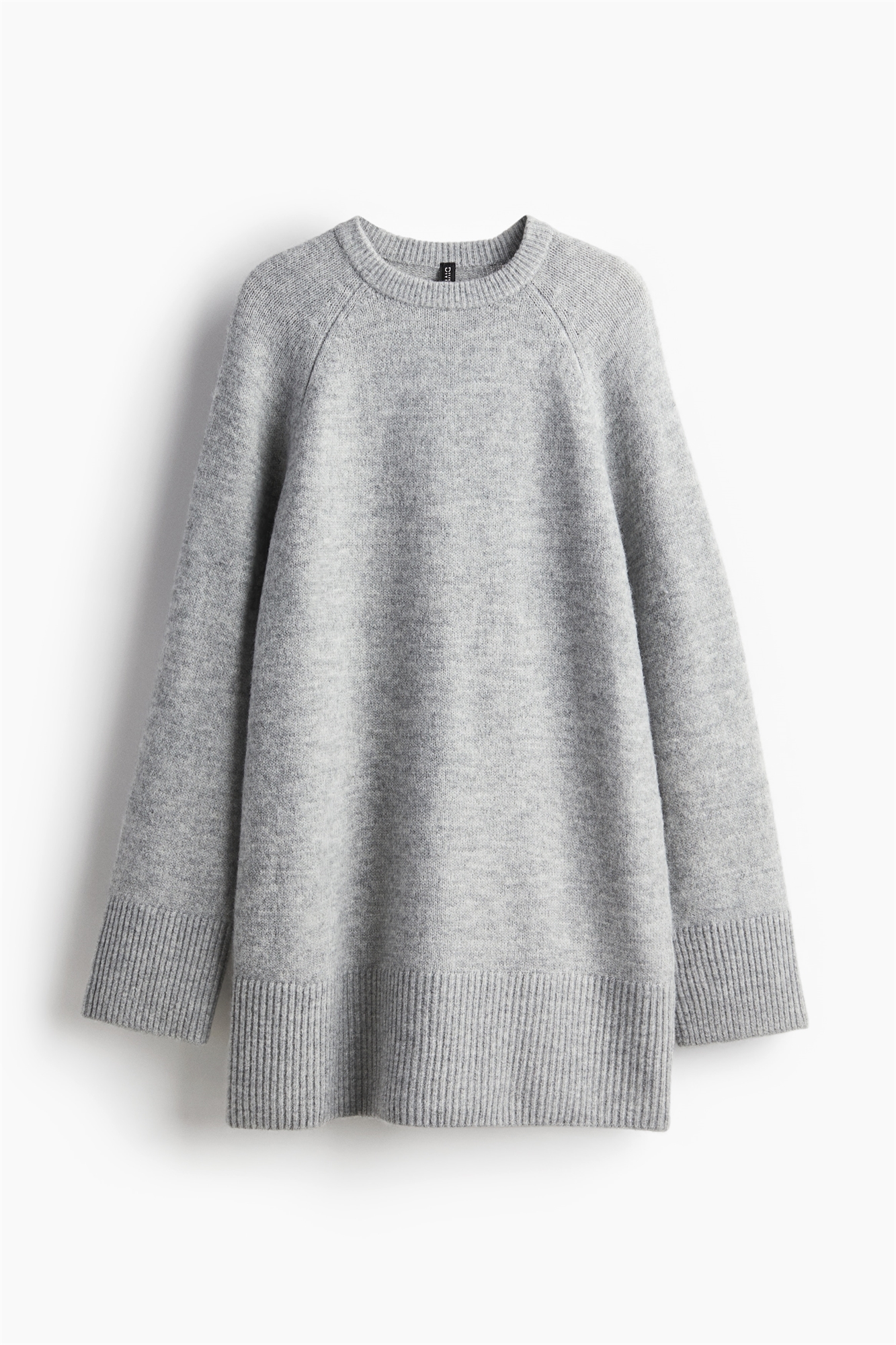 Короткое платье свободного покроя из мягкого трикотажа с круглым вырезом в рубчик, длинными рукавами реглан и рубчиками на манжетах и подоле.
