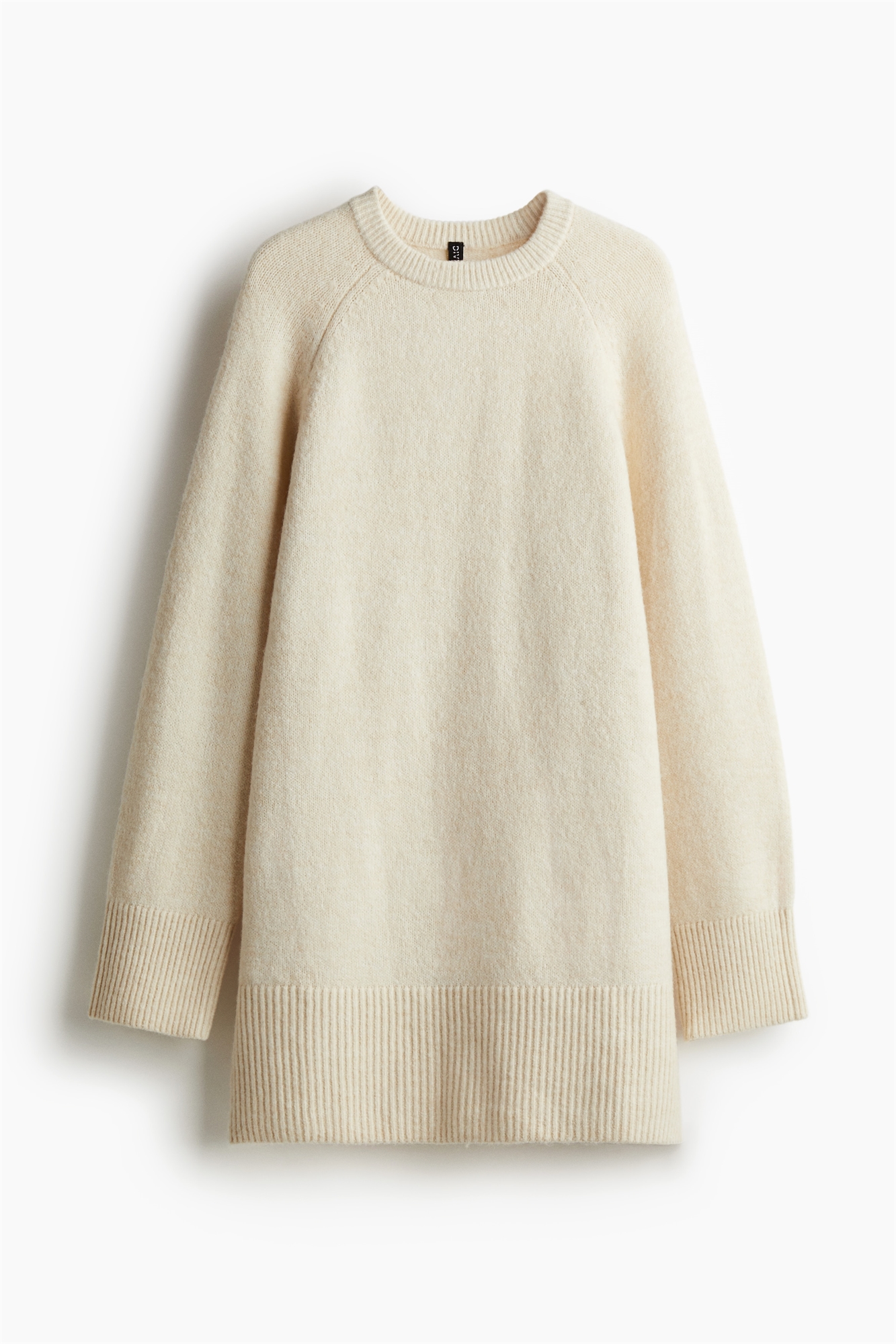 Короткое платье свободного покроя из мягкого трикотажа с круглым вырезом в рубчик, длинными рукавами реглан и рубчиками на манжетах и подоле.