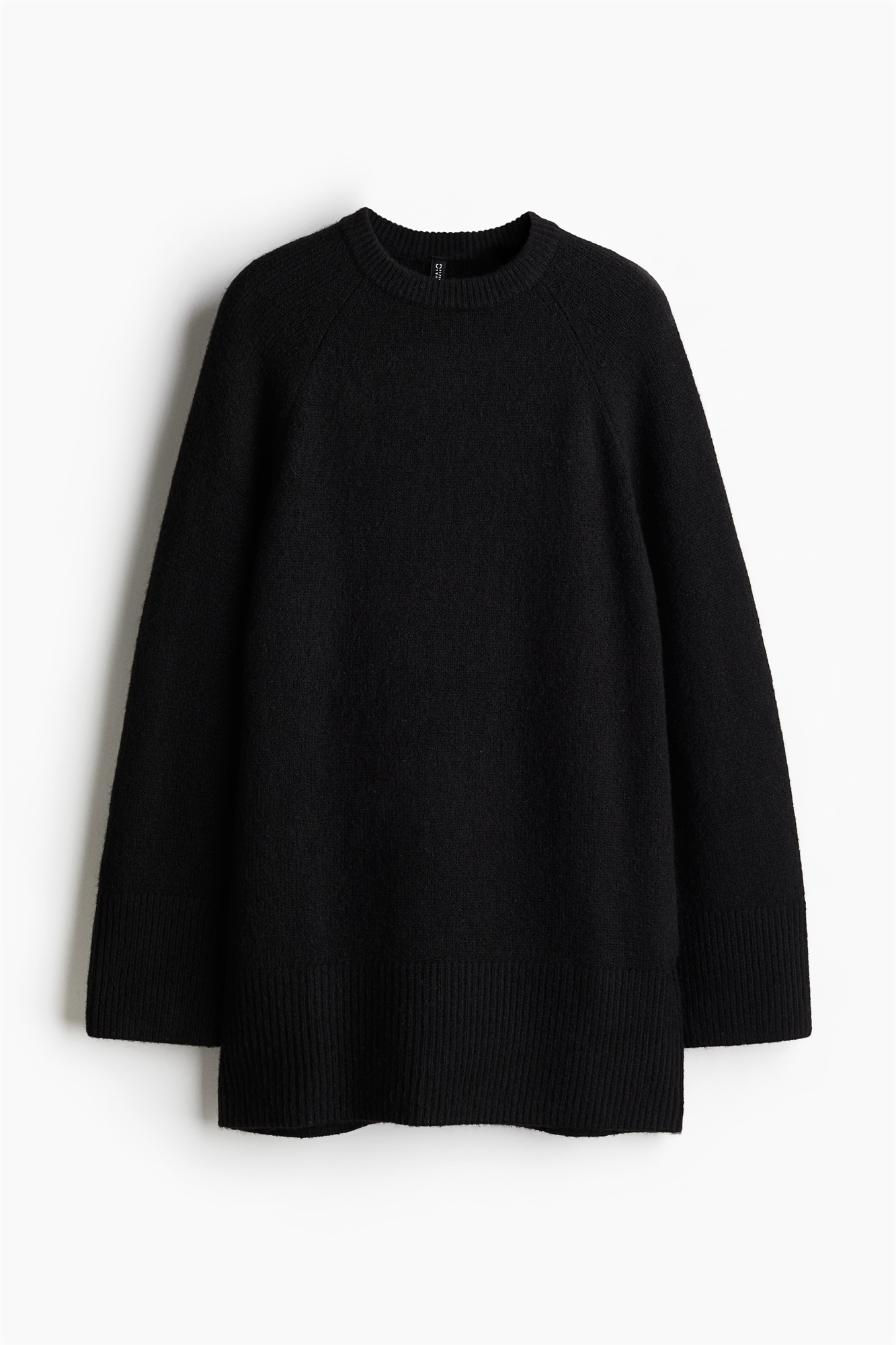 Короткое платье свободного покроя из мягкого трикотажа с круглым вырезом в рубчик, длинными рукавами реглан и рубчиками на манжетах и подоле.