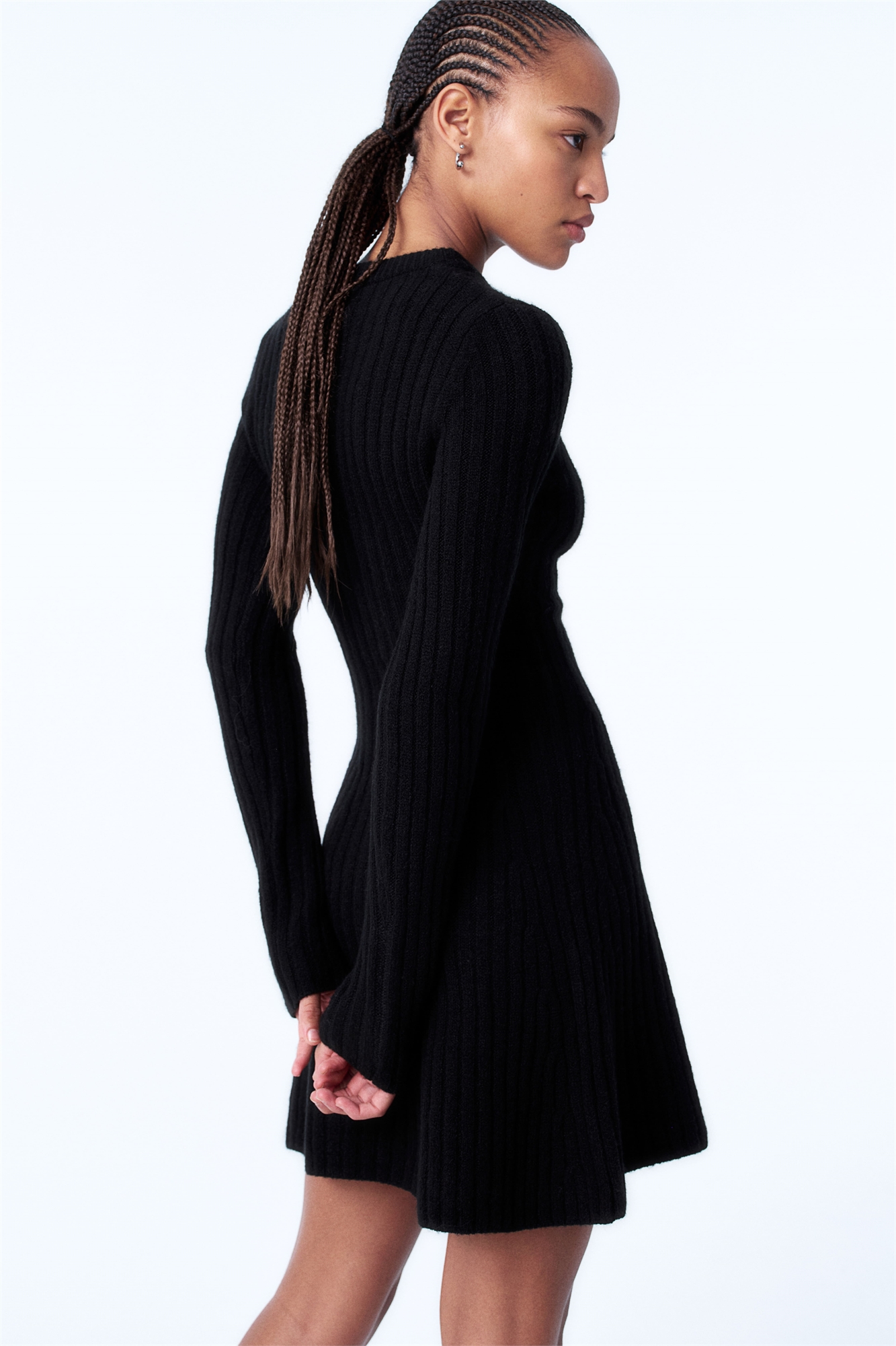 Короткое платье из мягкого трикотажа в рубчик с круглым вырезом и узкой окантовкой. Длинные рукава, приталенный лиф и расклешенная юбка.