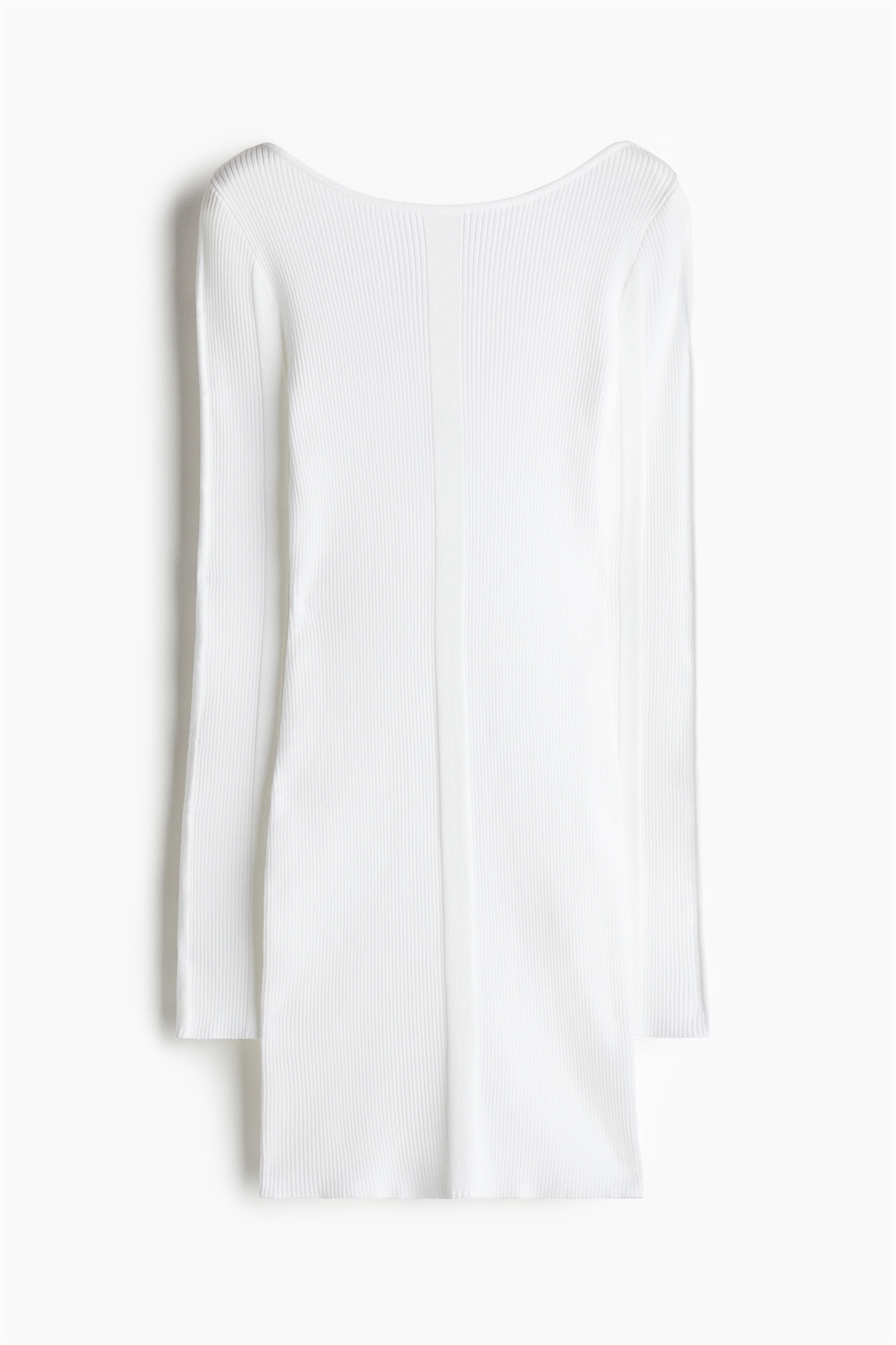 Короткое приталенное платье из неравномерного трикотажа в рубчик с изящным вырезом-лодочкой спереди, низким разрезом сзади и длинными рукавами.