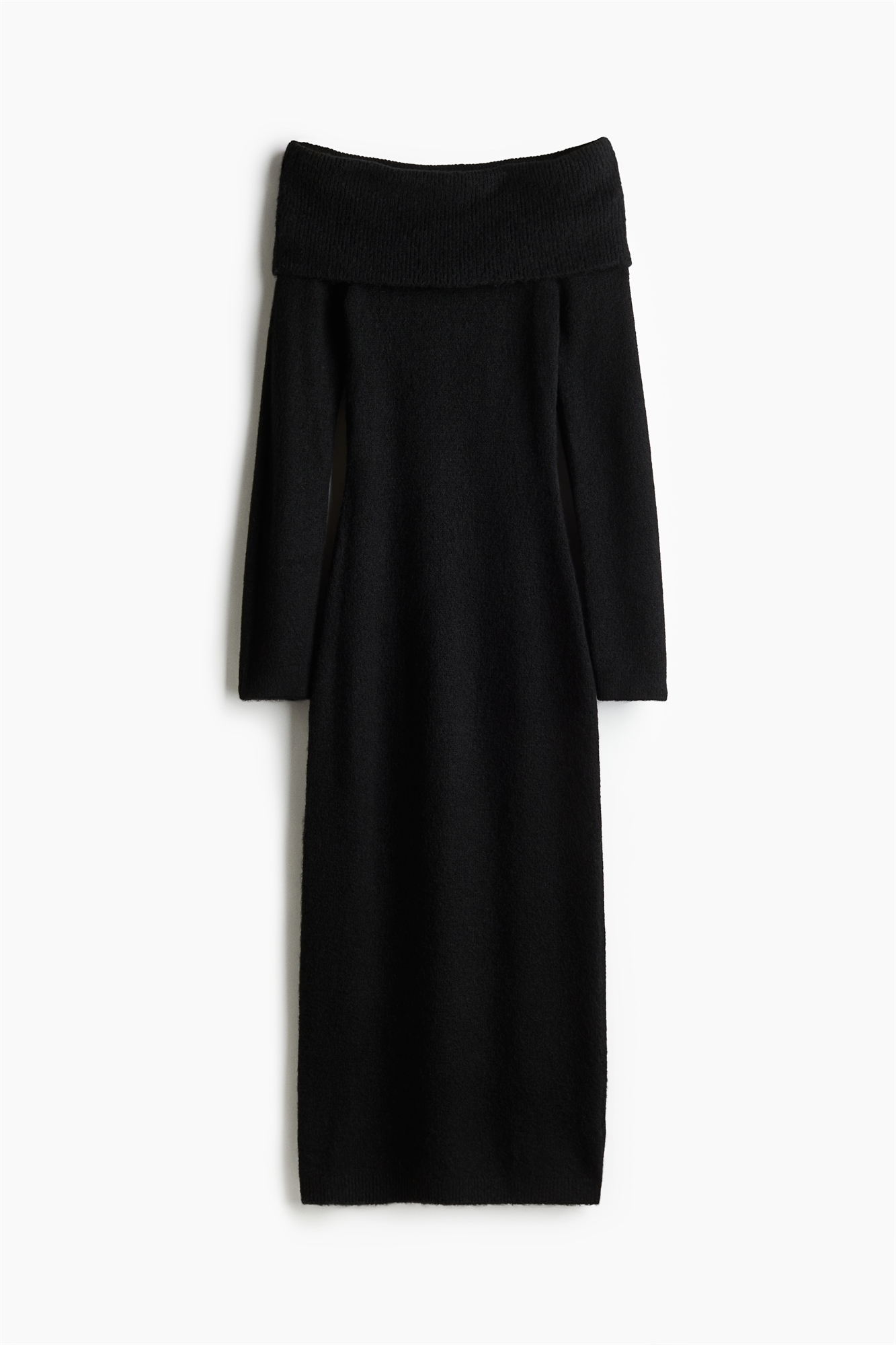 Приталенное платье длиной до колен из мягкого тонкого трикотажа с широким отложным краем и длинными рукавами. Ребристая отделка по верху, манжетам и подолу.
