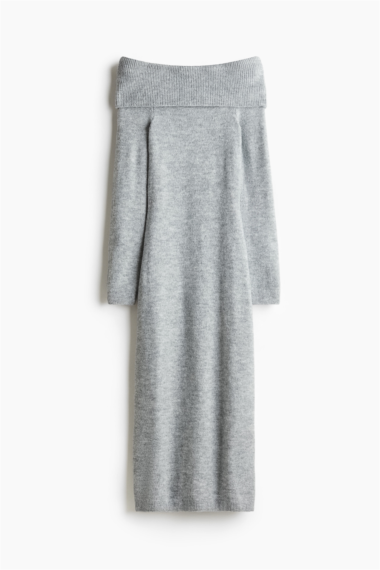 Приталенное платье длиной до колен из мягкого тонкого трикотажа с широким отложным краем и длинными рукавами. Ребристая отделка по верху, манжетам и подолу.