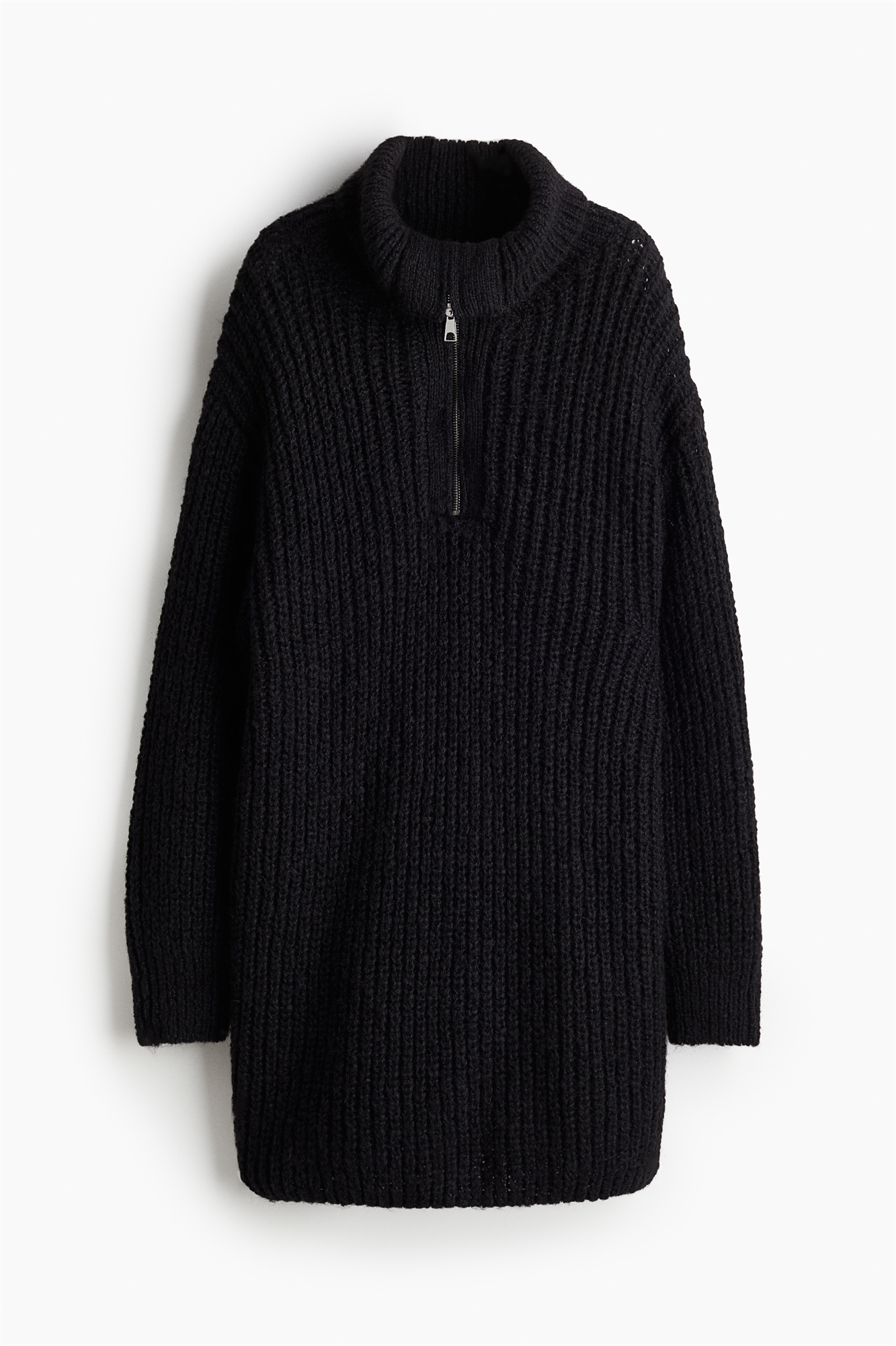 Короткое платье свободного покроя из мягкого трикотажа в рубчик с горловиной поло, застежкой-молнией в верхней части, спущенными плечами и длинными рукавами. Узкая тесьма вокруг горловины поло и манжет и прямой подол.