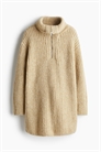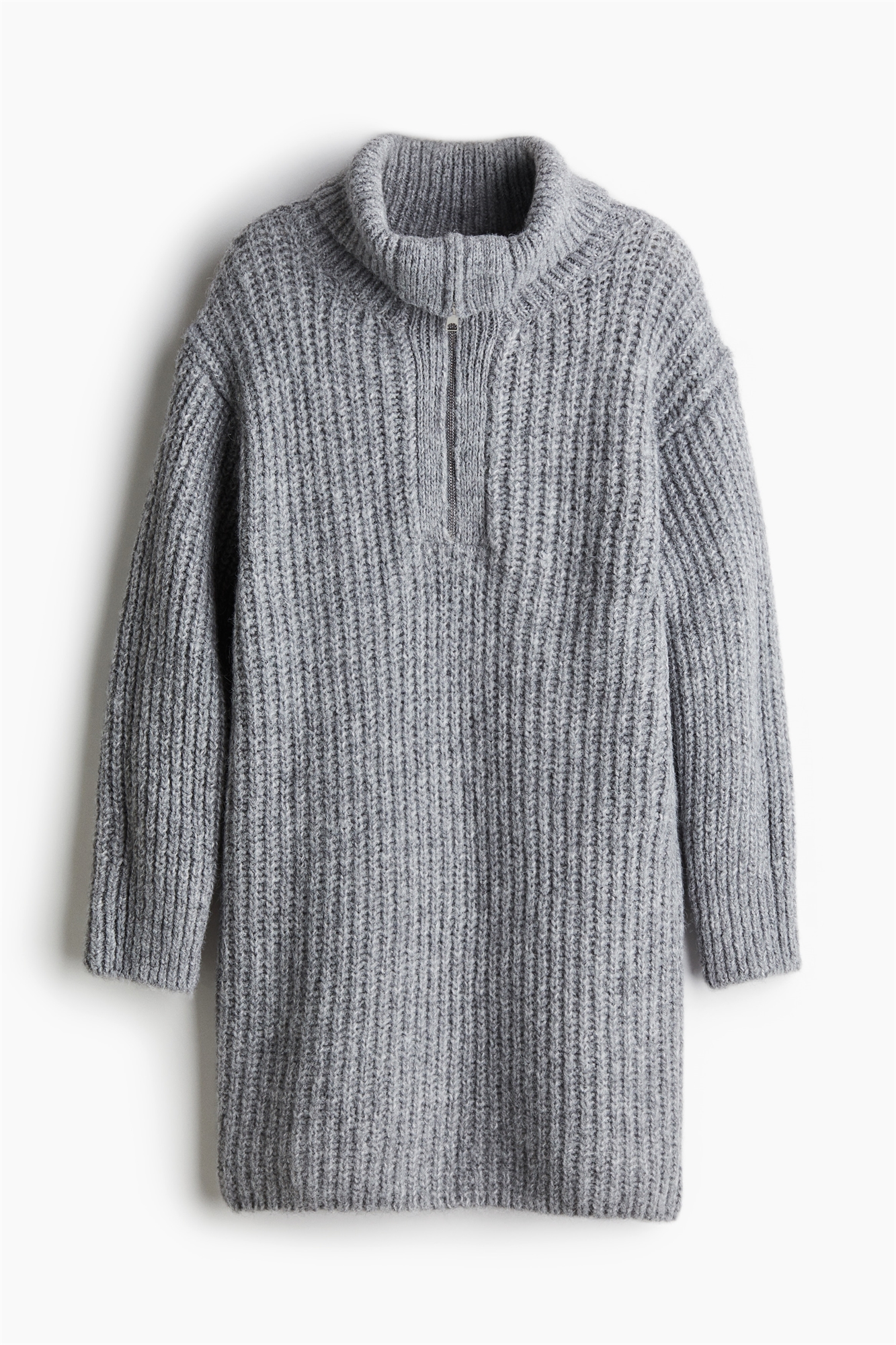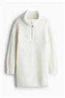 Короткое платье свободного покроя из мягкого трикотажа в рубчик с горловиной поло, застежкой-молнией в верхней части, спущенными плечами и длинными рукавами. Узкая тесьма вокруг горловины поло и манжет и прямой подол.