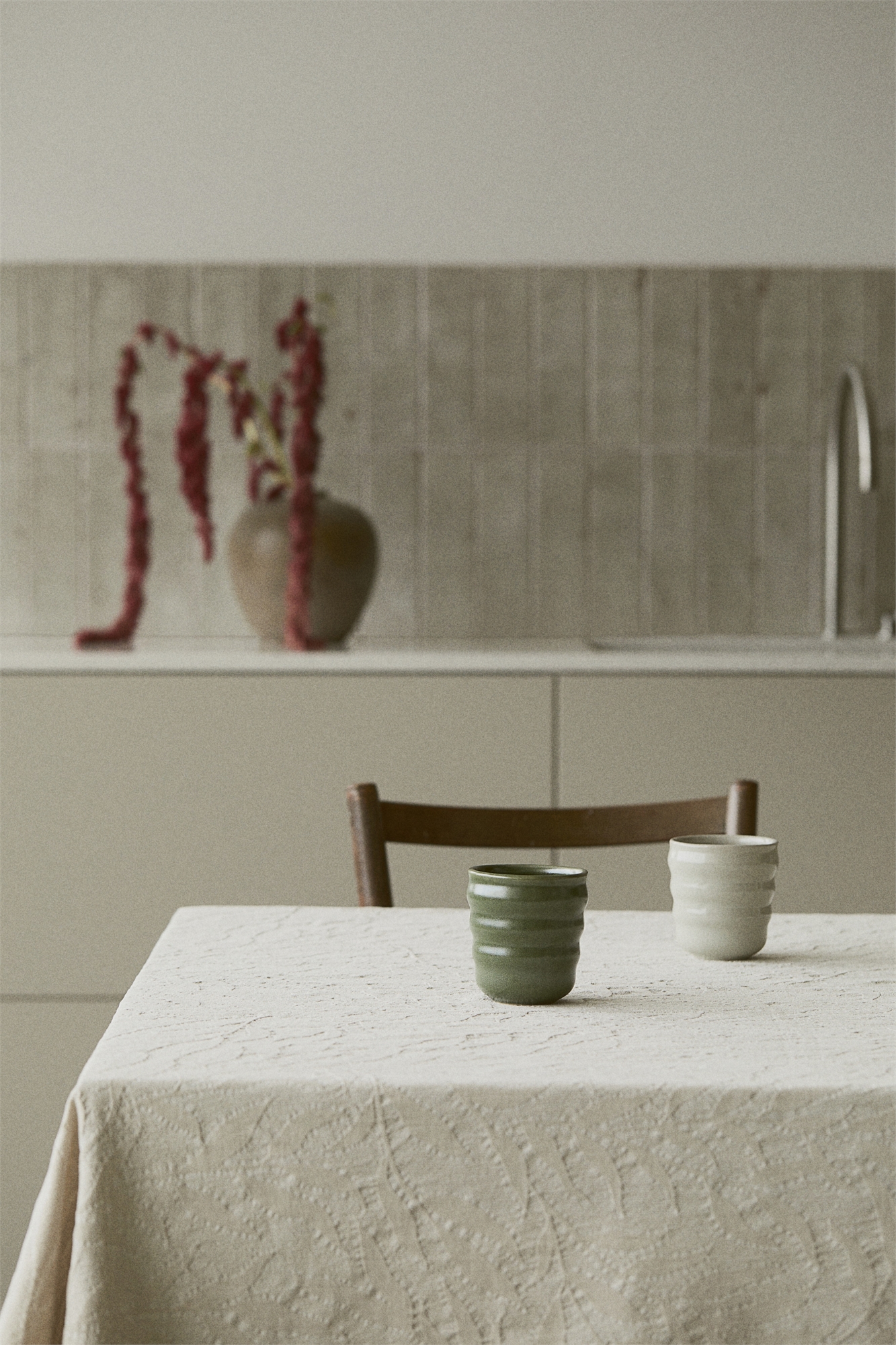 Кружка из глазурованной керамики с рифленой отделкой. Диаметр в верхней части 8,5 см. Высота 9,5 см.
