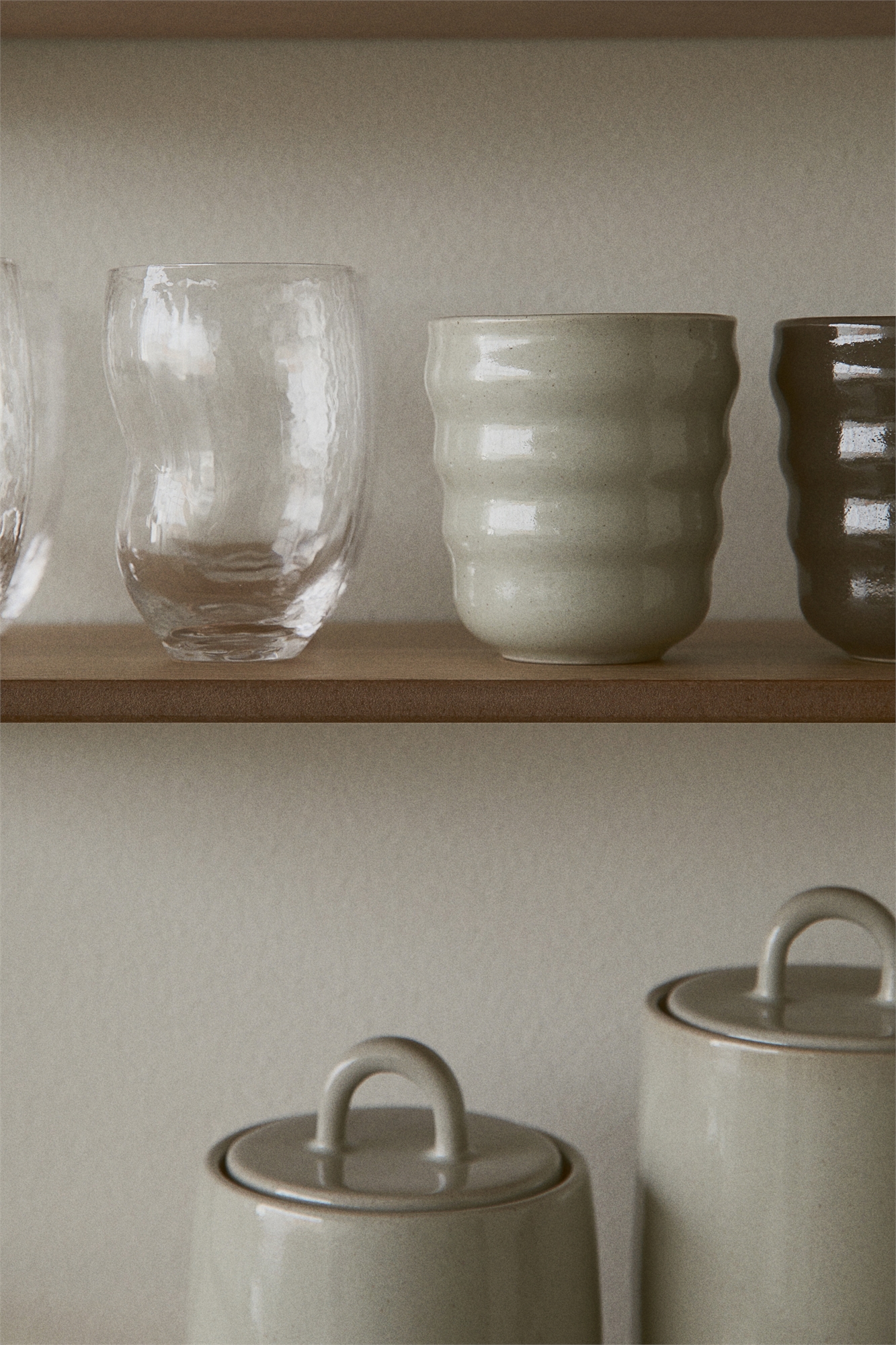 Кружка из глазурованной керамики с рифленой отделкой. Диаметр в верхней части 8,5 см. Высота 9,5 см.