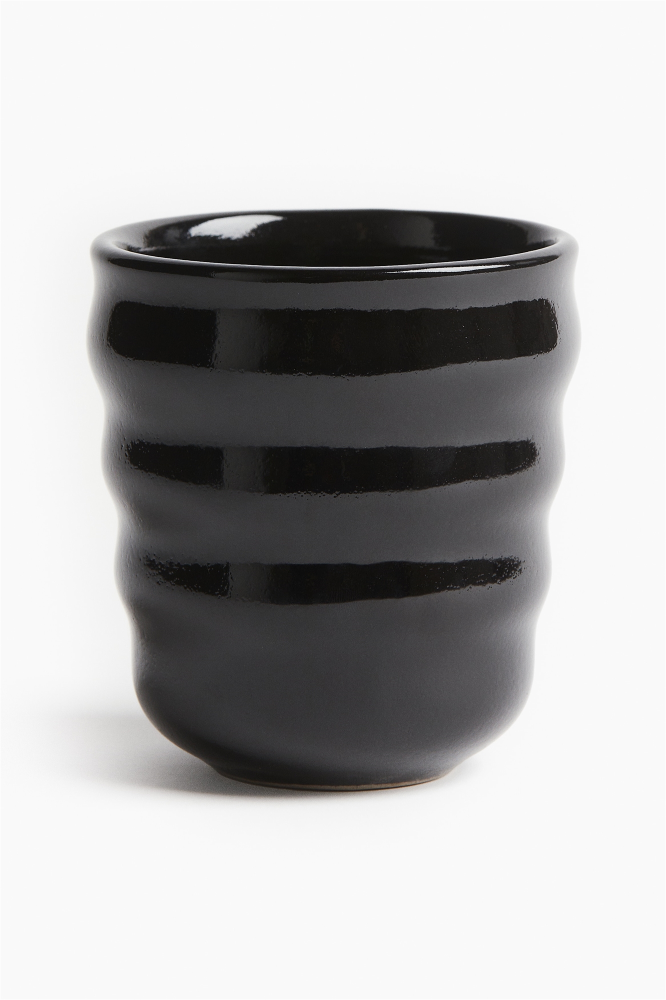 Кружка из глазурованной керамики с рифленой отделкой. Диаметр в верхней части 8,5 см. Высота 9,5 см.