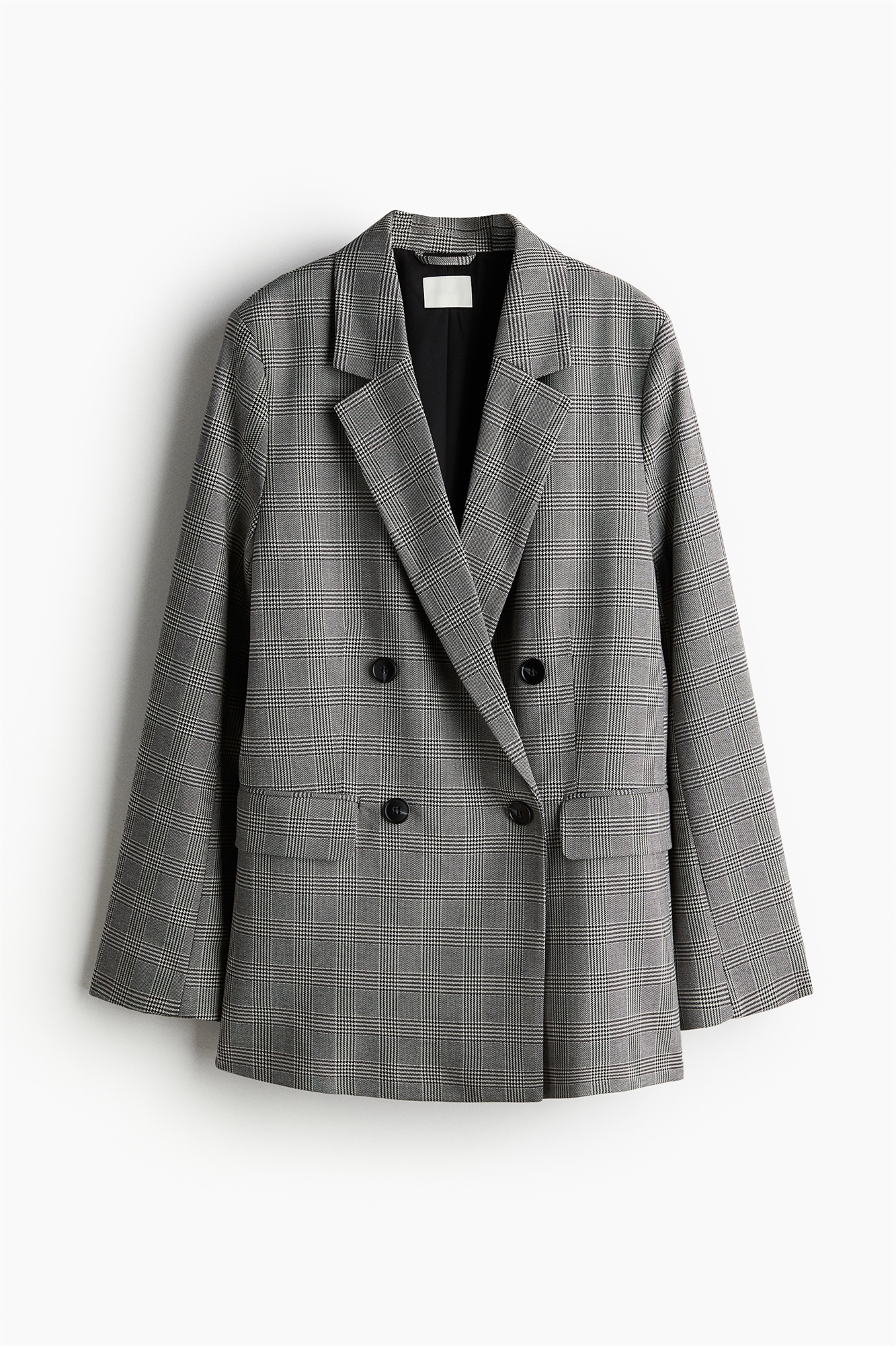 Слегка удлиненный двубортный блейзер с лацканами с вырезом и пуговицами спереди. Накладки на плечах, длинные рукава и втачные передние карманы с клапаном. На подкладке.