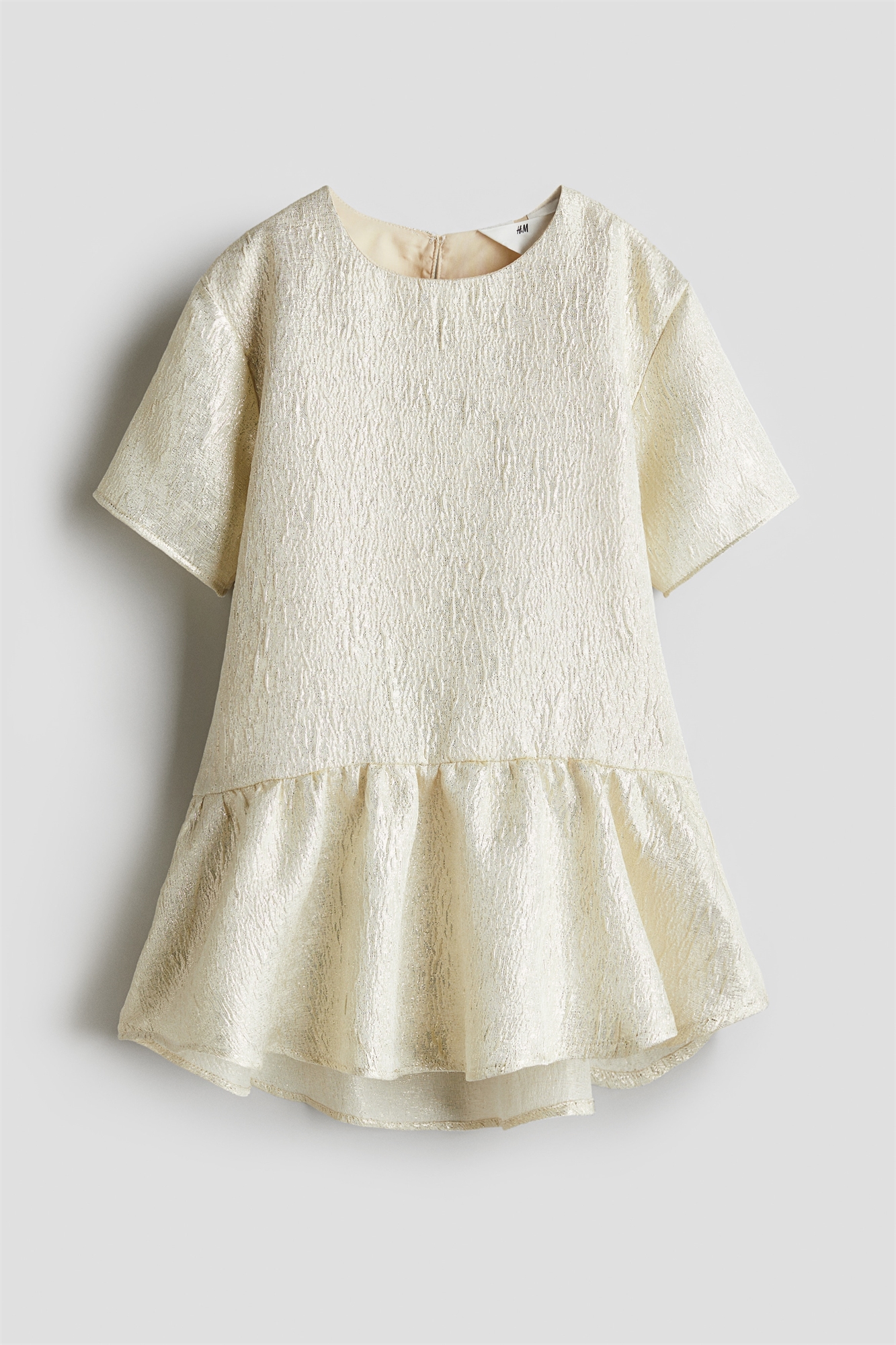 Платье из жаккардового переплетения с круглым вырезом и прорезью для ключа с пуговицей сзади. Спущенные плечи и короткие рукава. Присборенный шов ниже талии и расклешенная юбка. На подкладке.