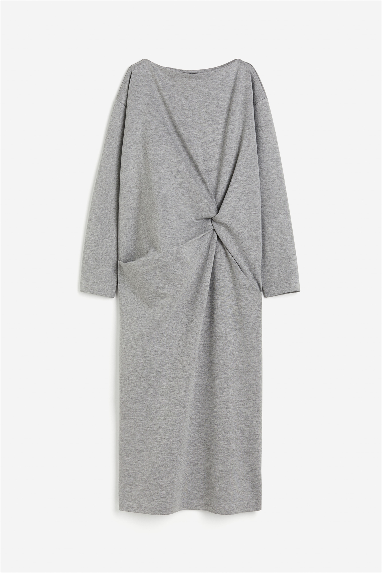 Платье длиной до колена из мягкого вискозного джерси с изящным вырезом-лодочкой и декоративной деталью "твист" на талии спереди. Приталенный крой, спущенные плечи, длинные рукава и прямой подол.